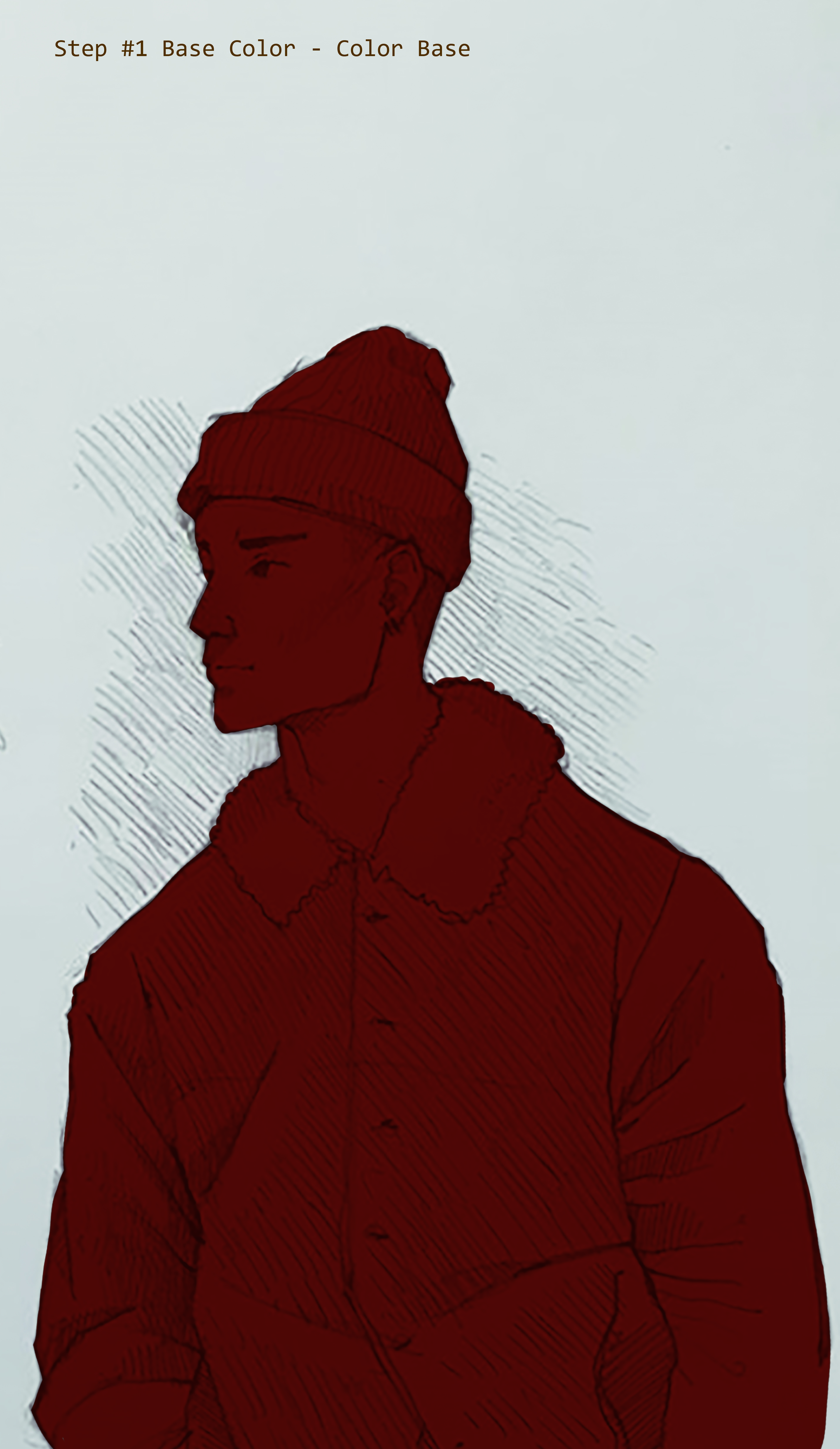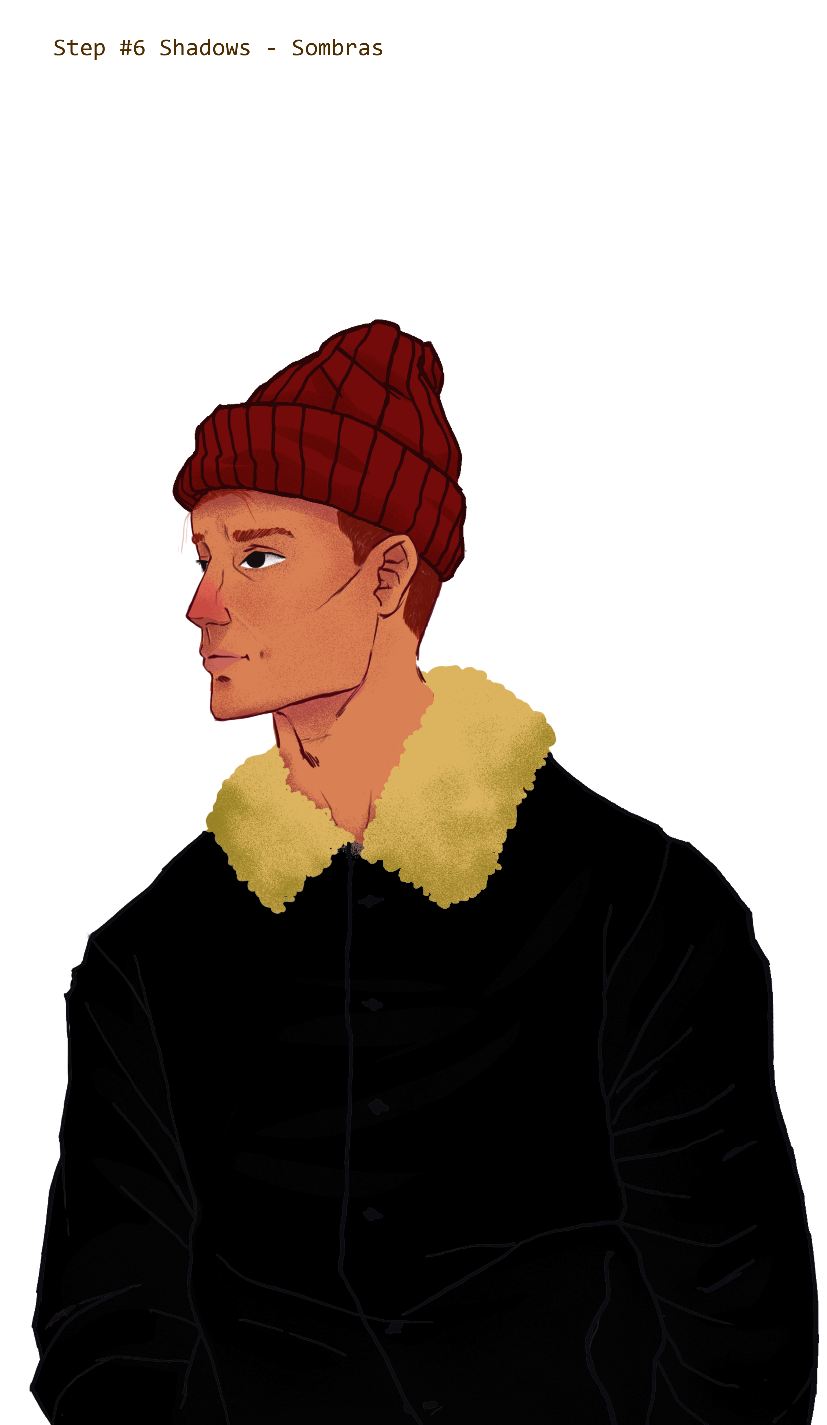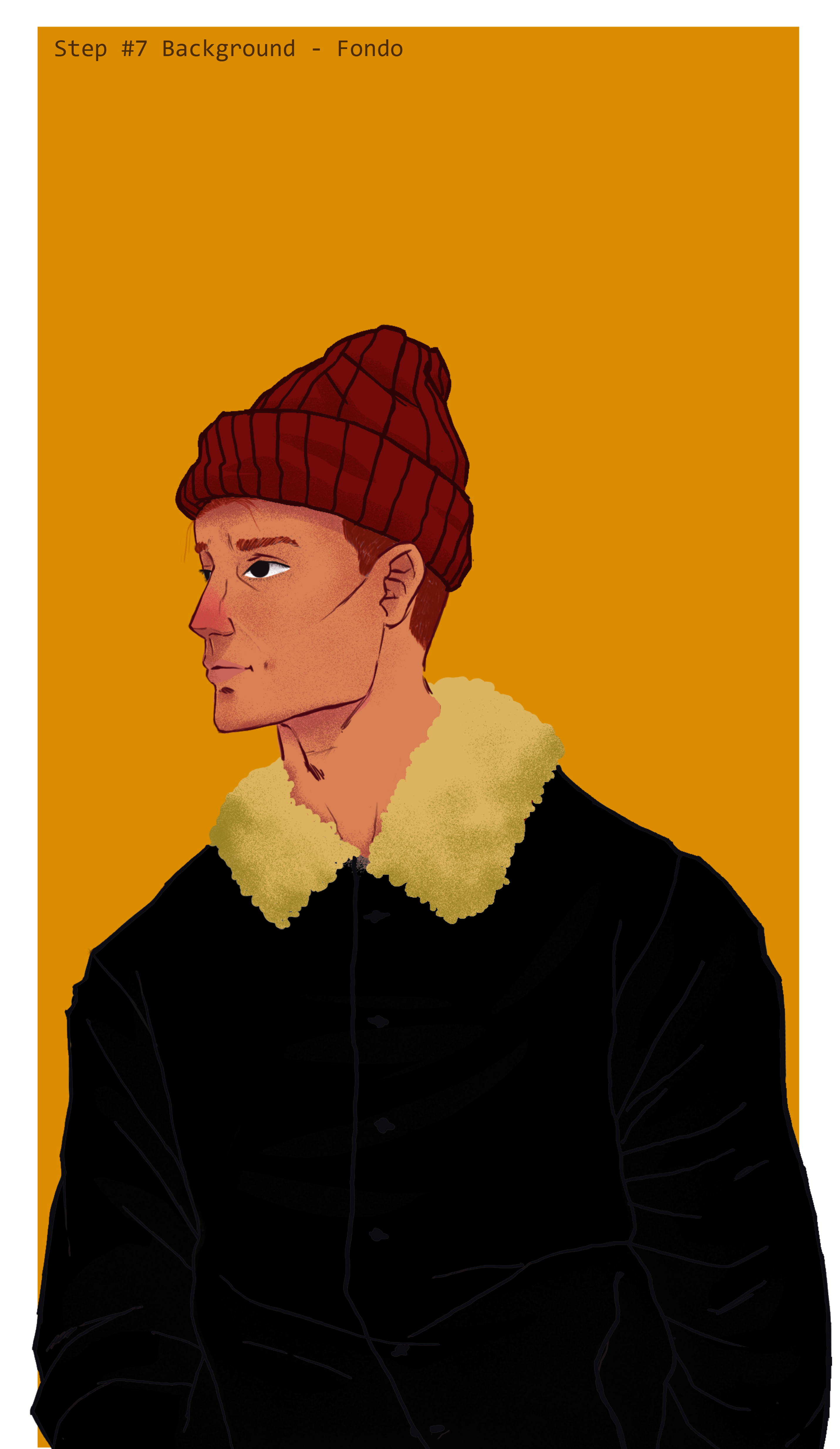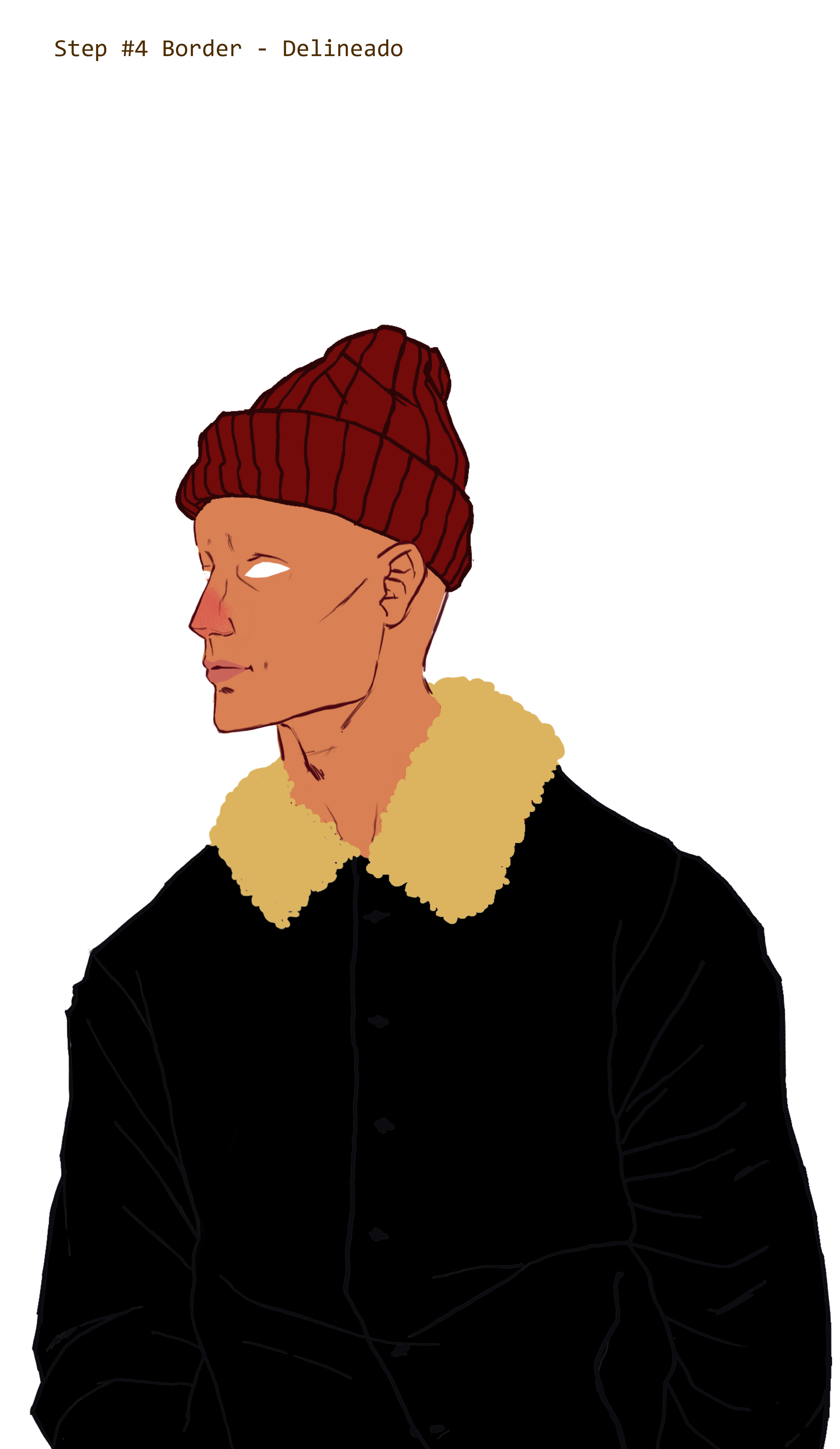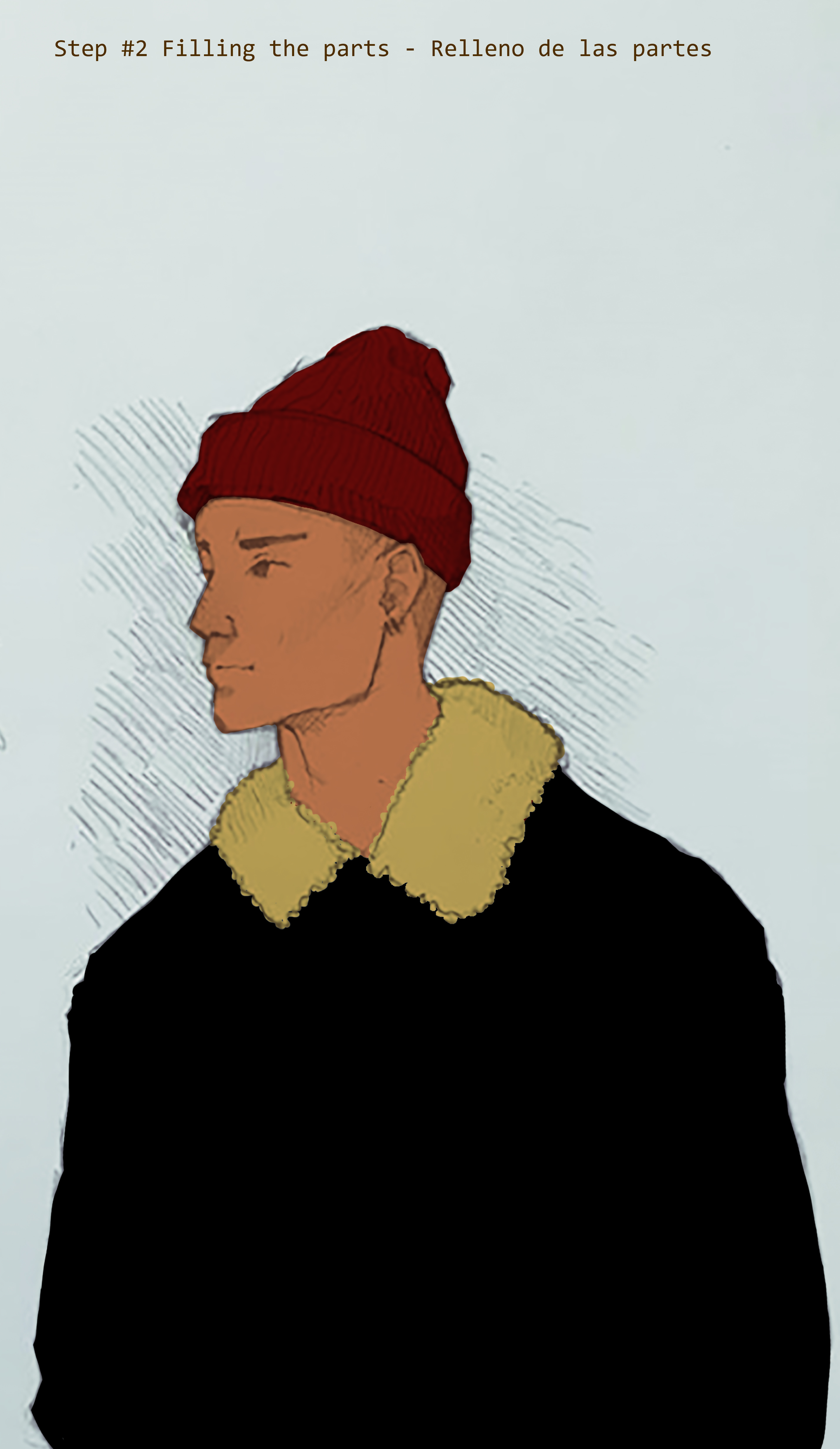 The first step what I usually do is make a base of any color, but make it perfect, this so that in Photoshop I can make masks and not go beyond that limit. En este paso lo que hago es rellenar de color base cada elemento del dibujo, en este caso la pie, la gorra, la chaqueta y el cuello de la chaqueta.