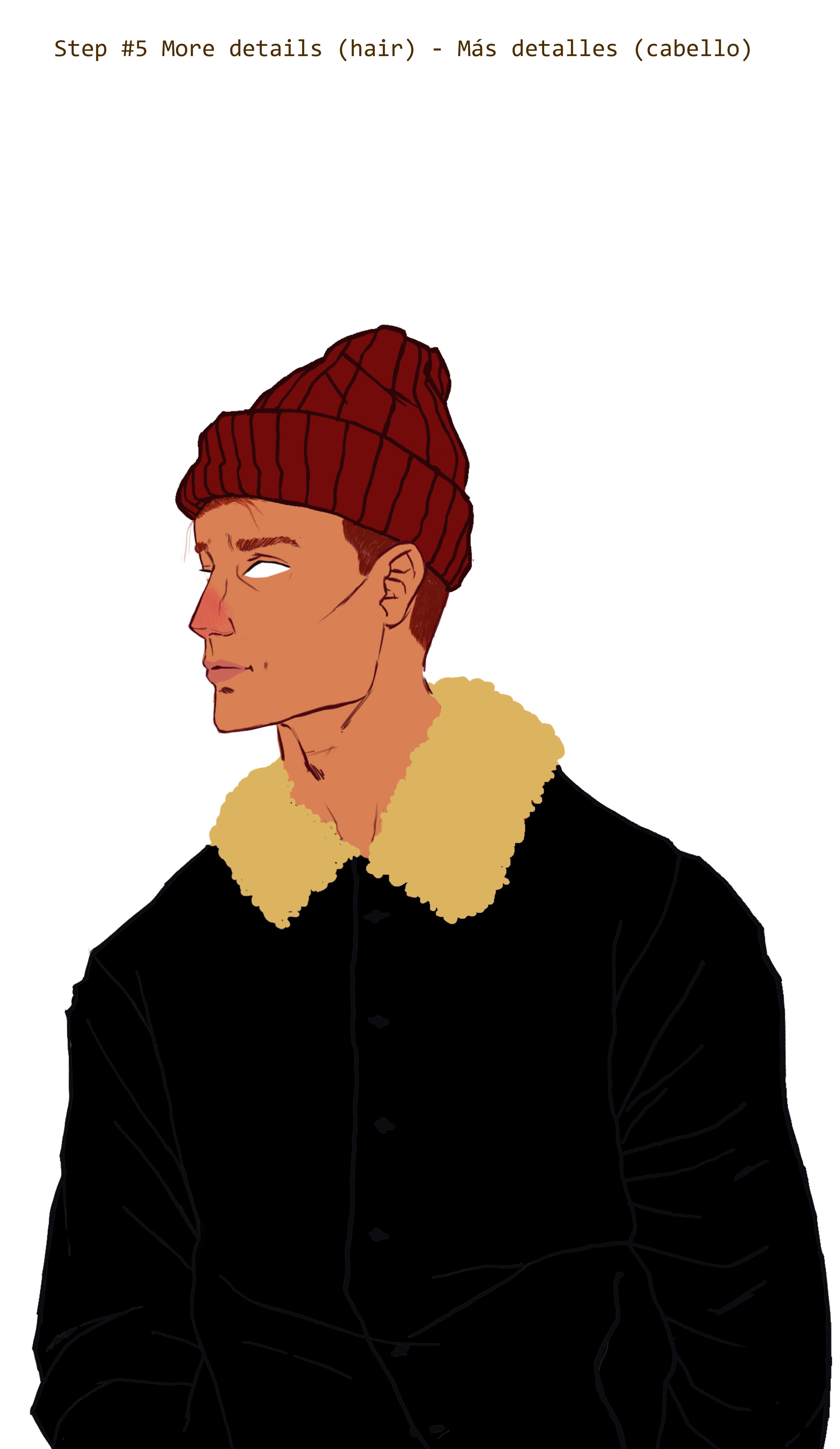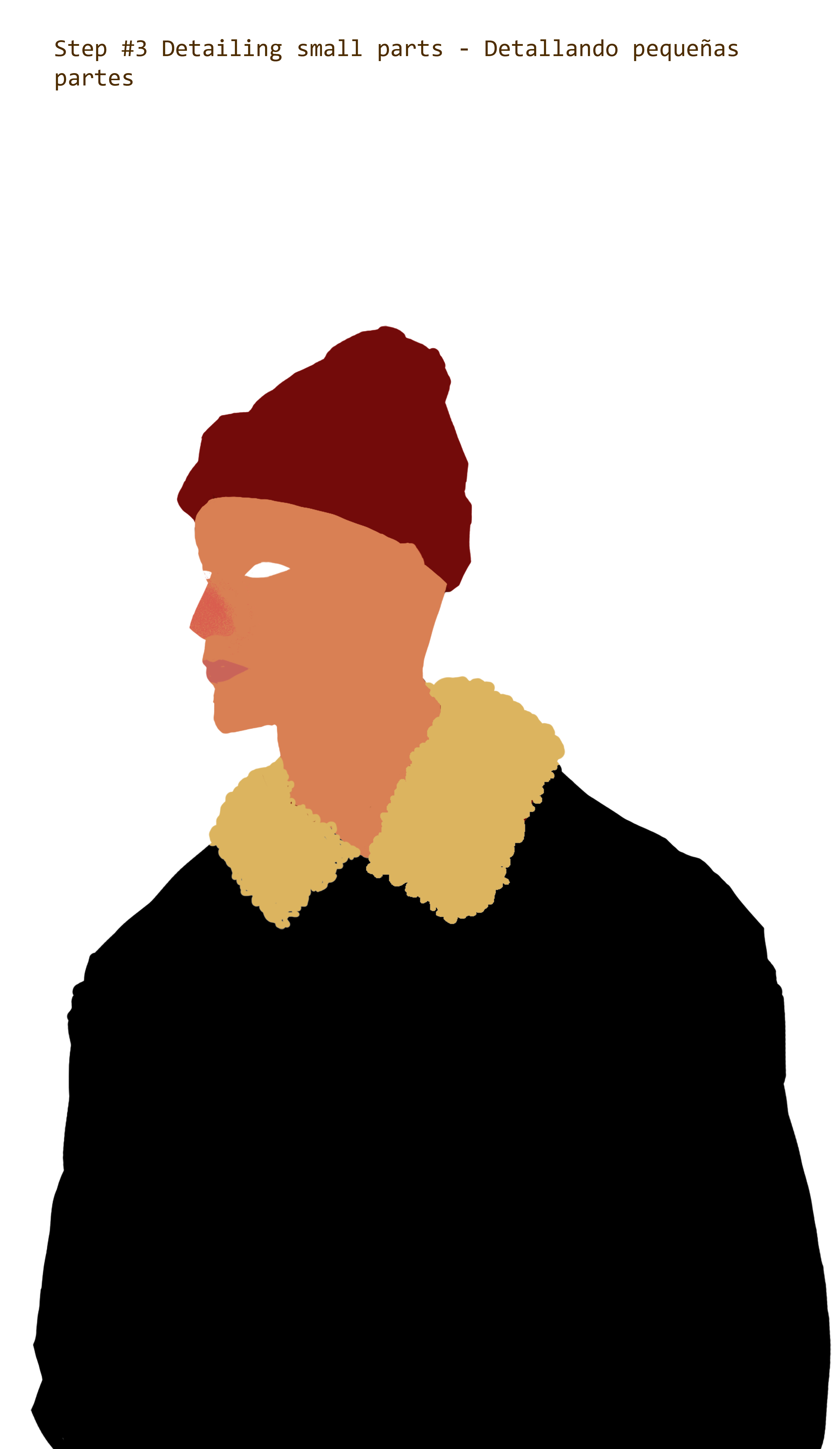 In this step what I do is fill each element of the drawing with base color, in this case the foot, the cap, the jacket and the collar of the jacket. En el tercer paso lo que hago es rellenar algunos elementos más pequeños como los ojos labios, etc