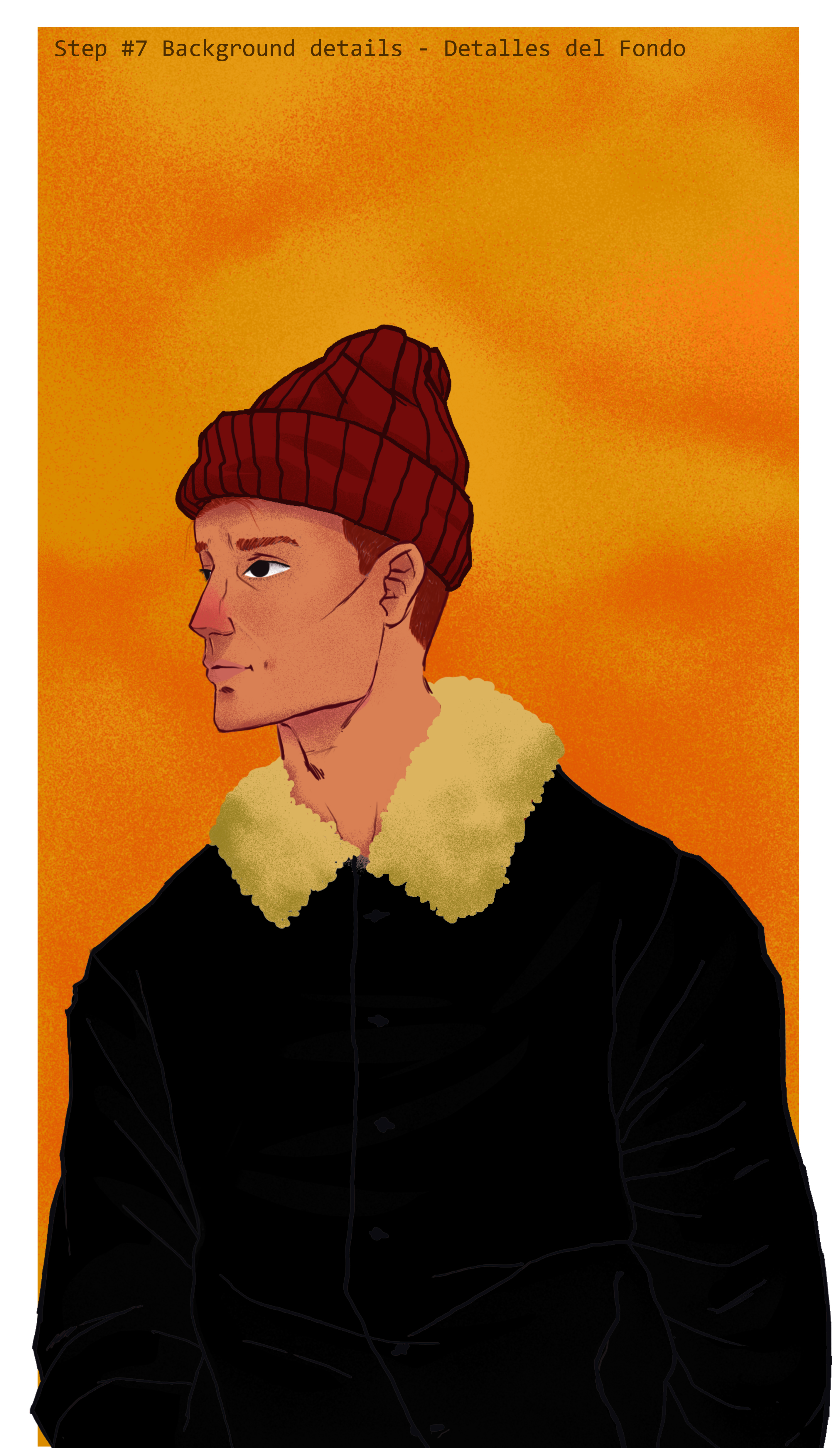 The background is an element that I like to add to it, normally I use a flat color trimmed so that it is left with a dilation to eventually print and frame it. In this drawing I wanted a range of warm colors, between reds and yellows, for that reason I chose that background color. En este paso prácticamente son detalles del fondo, quería agregarle una nubosidad sencilla con el pincel granulado, para que el fondo no fuera tan simple
