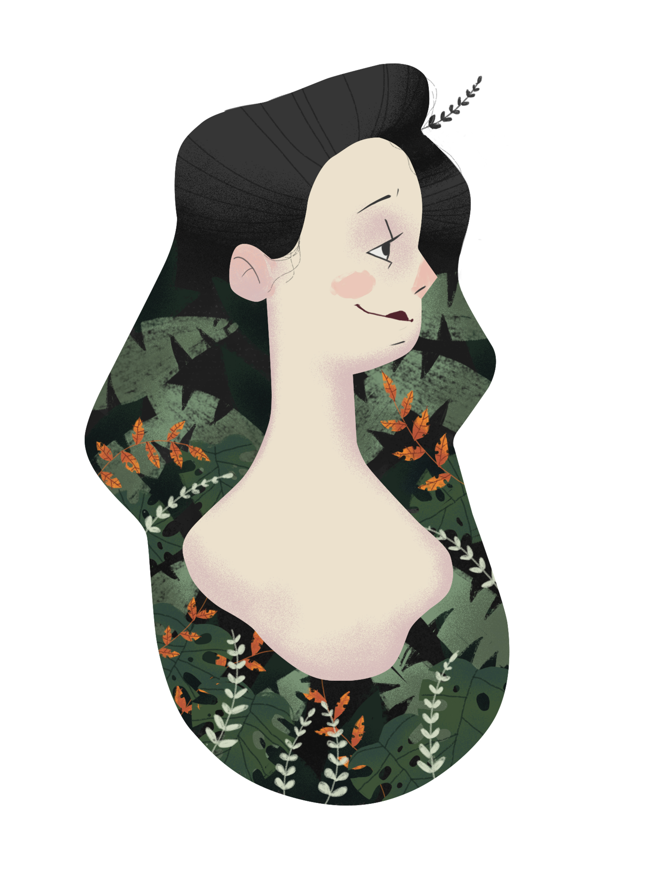 Ya teniendo la base de colores que se habló en el paso anterior, empecé a rellenar cada elemento generando ese contraste entre los verdes y los naranjas con el fondo oscuro, consiguiendo una composición cromática bonita, con mucha fuerza.