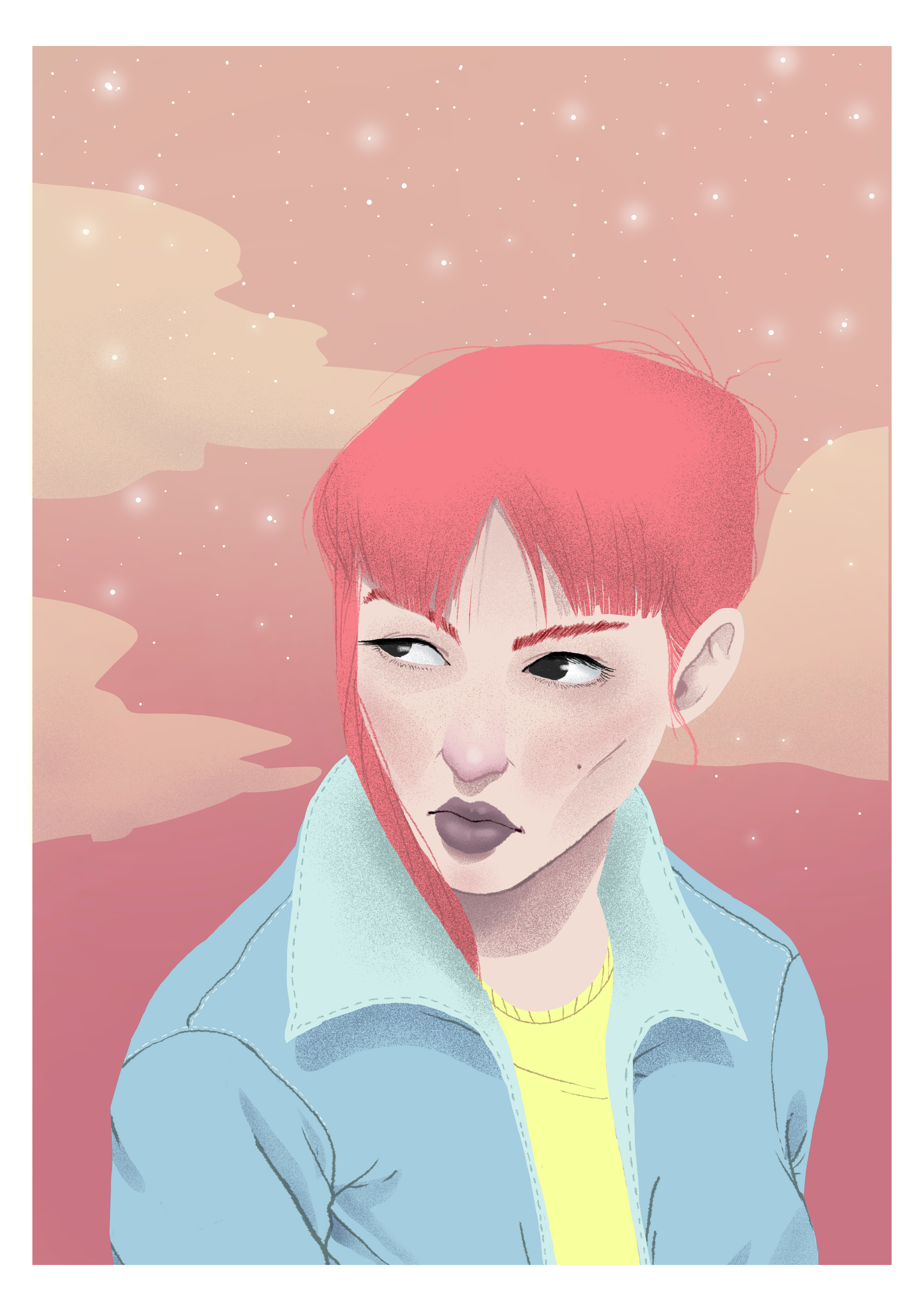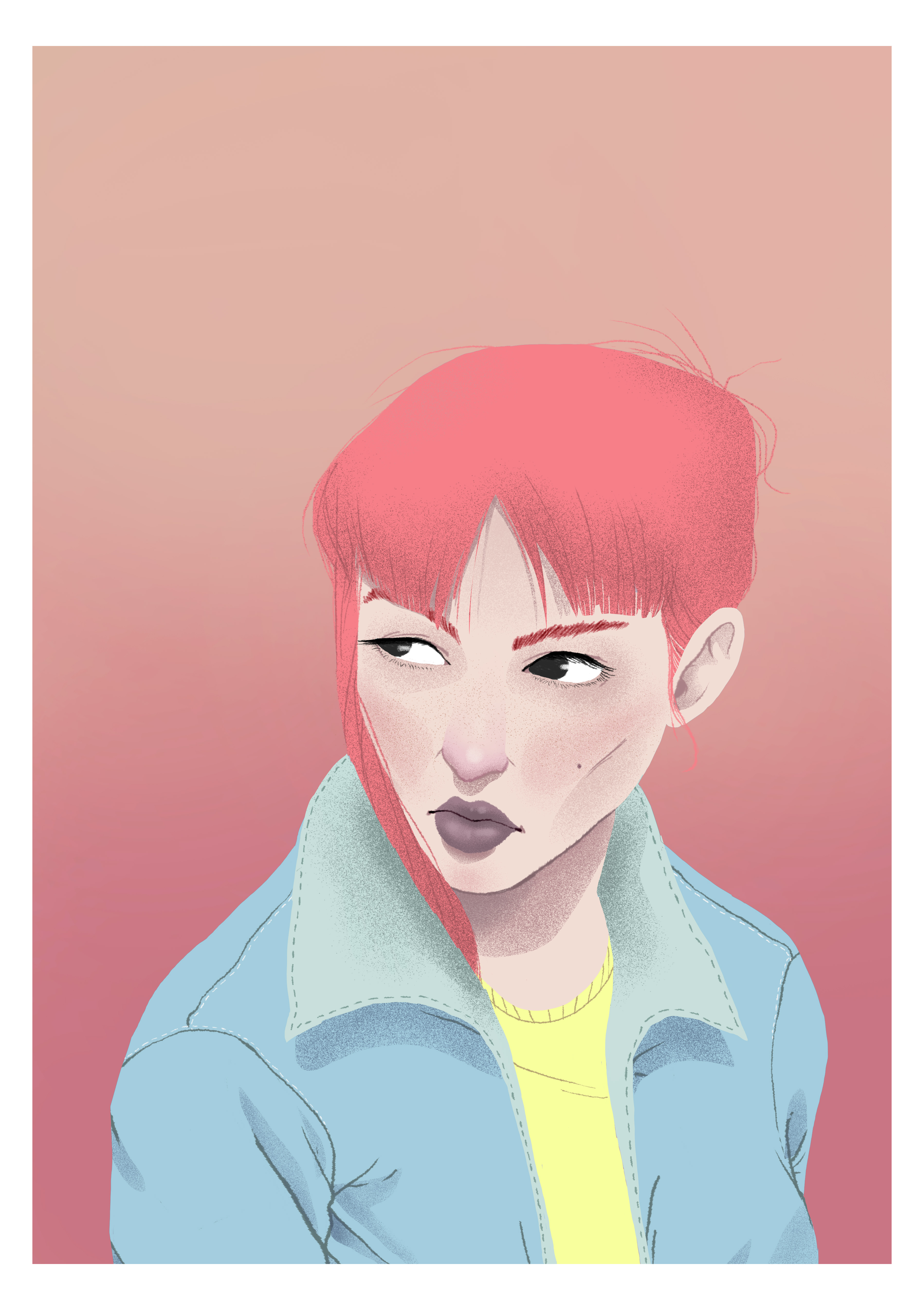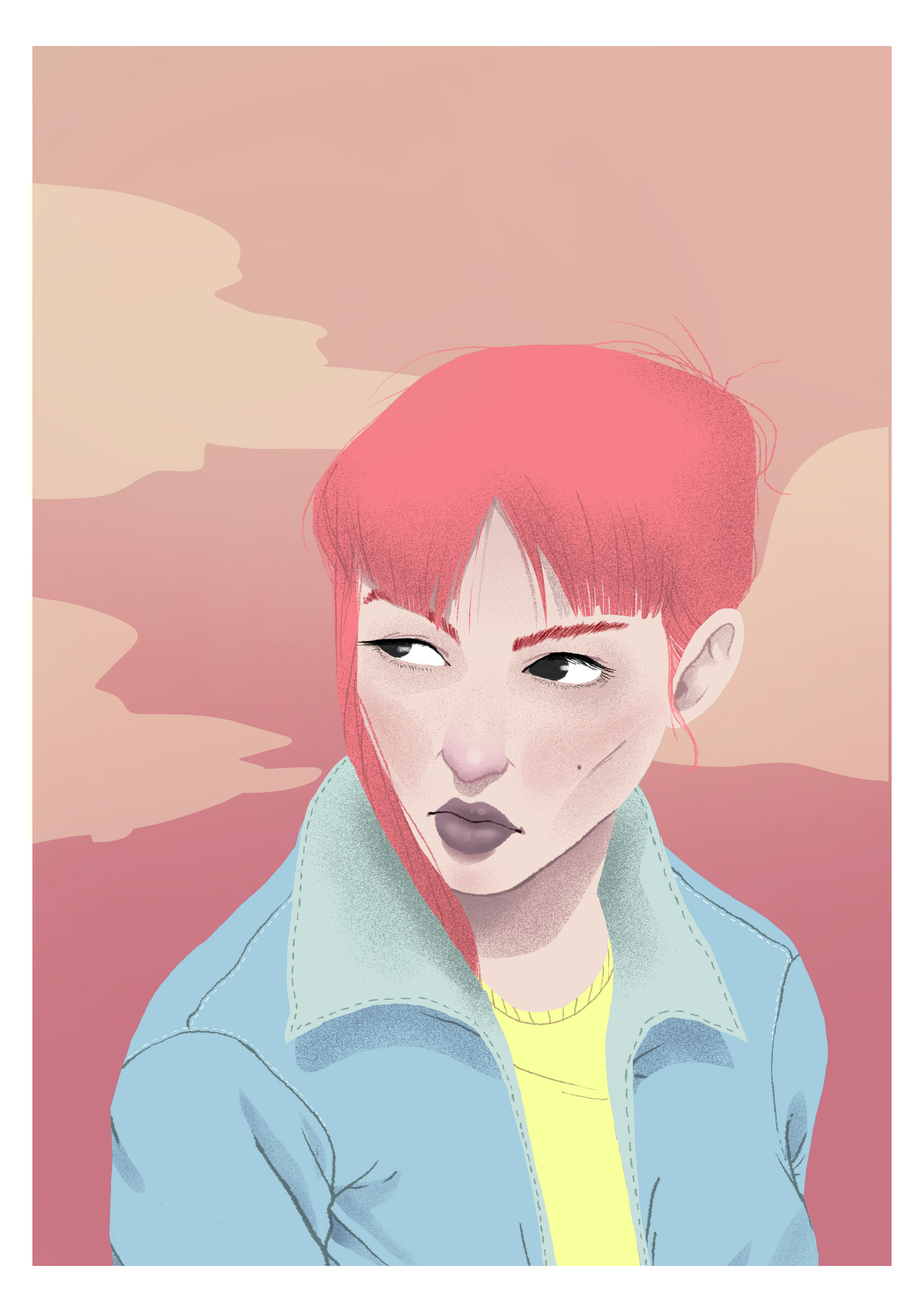 At the time of choosing the background that at the same time will be the landscape of the illustration, I wanted to choose some reddish colors, trying to imitate a sunset. The colors were a shade of skin color a little red, and a red pulling like a magenta and that in turn this color is the same hair but thanks to degradé with the superior color this contrasts perfectly.