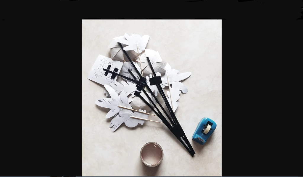 for this part, I drew on some flowers and leaves onto some HVS paper, cut it out, and stick it on a bamboo skewer with tape. at this point you can make as many or as few as you like, or maybe throw in some ribbons and glitters and other decorations.