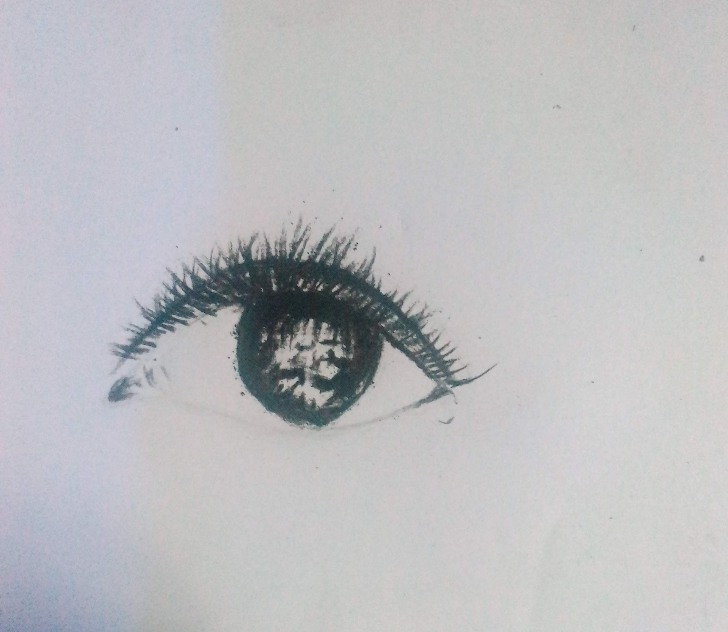 Now using the black Charcoal pencil, I draw out the outline of the eyes and add darkness areas to the parts of the world that are dark or require shade i.e the lens, eyes lids eye lashes.