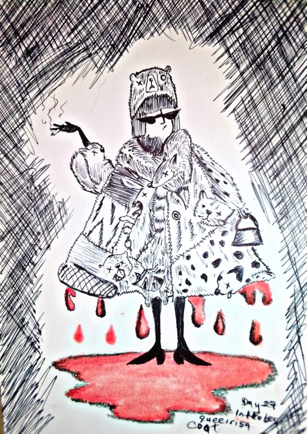 This was one of my most creative inktober drawing. The drawing depicts a lady wearing a furry coat which is actually made of the skin of some dead furry animals. A cat, dog, rabbit, raccoon, bear and squirrel can all be seen on the coat which is dripping of blood from these animals. To spice it up, I added shades and a cigarette to make her look like a villian.