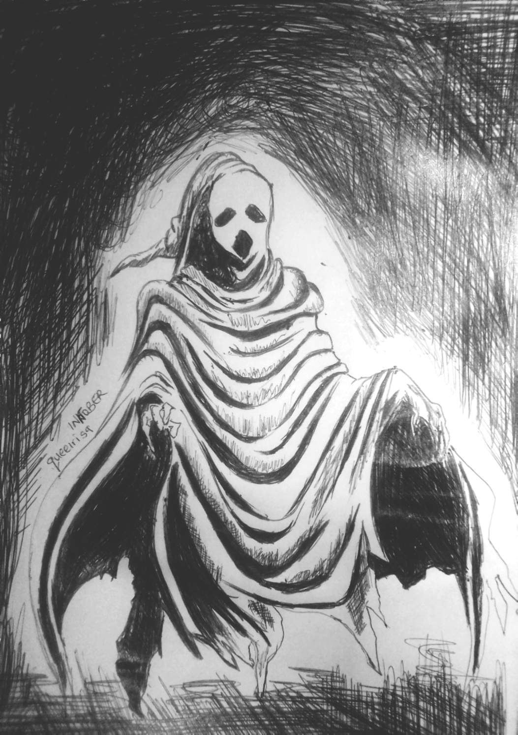 In folklore , a ghost is the soul or spirit of a dead person or animal that can appear to the living. So many traditional groups often thought and believed that ghosts were deceased people looking for vengeance or imprisoned on earth for bad things they did during their lifetime. A ghost is often regarded as an omen or portent of death so I had to make a drawing to portray that. This drawing was made using a black ball point pen to give a scary and terrific impression of a ghost and it got a good feedback from the steemit community.