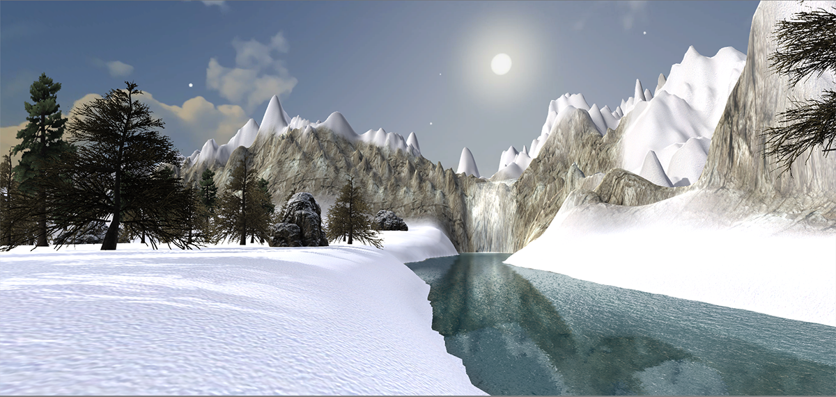When the base was done I started to put down a lot of trees, bushes and rocks in the environment. The terrain started to look alive but was missing some things I started implementing some effects like snow and a waterfall.