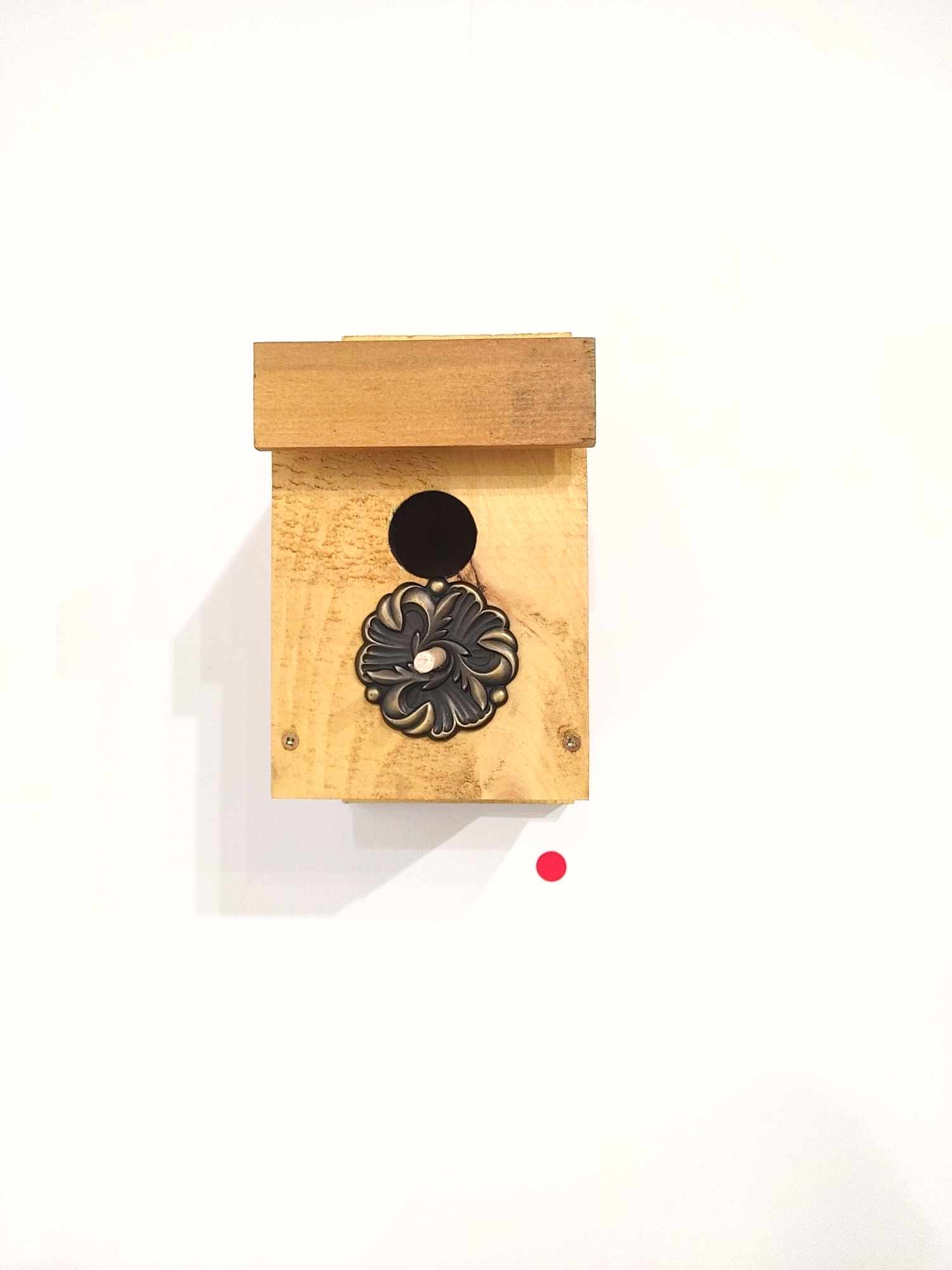 This one is called The Orange House. It's named for the stain used to tint it. There are four of these birdhouses in the show. Onion House, Orange House, Copper House, and Walnut House. We made the orange stain at home using orange rinds. I thought I was helping create a stain using a naturally occurring pigment, but it turns out as I found out afterward that most oranges we enjoy in North America are pigmented to be orange so that we'll find them more appealing. Same with cheddar cheese.