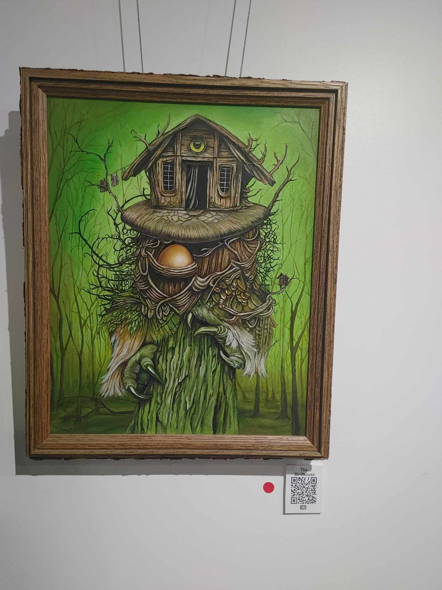 This piece is my MOST sold piece. The Birdhouse. Inspired by Baba Yaga's cottage on bird feet, but using owl legs instead of chicken. It's in Mikey's show because he wanted it as an example of his custom framing. He had it in his show last year, too. We had two people say they wanted to buy it last year. Neither of them were able to follow through.