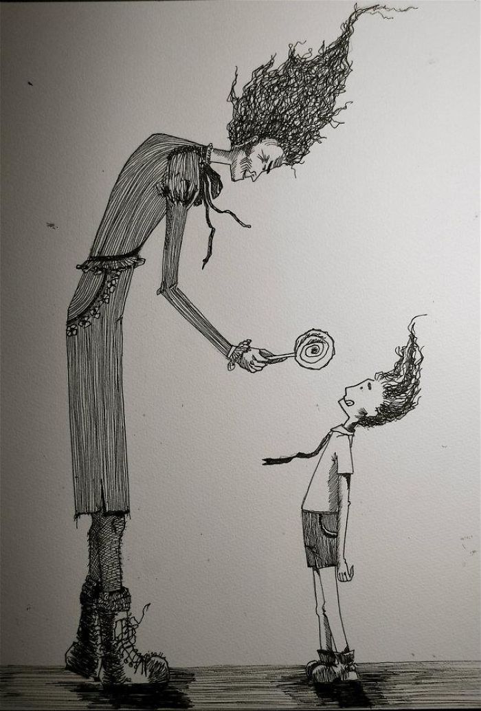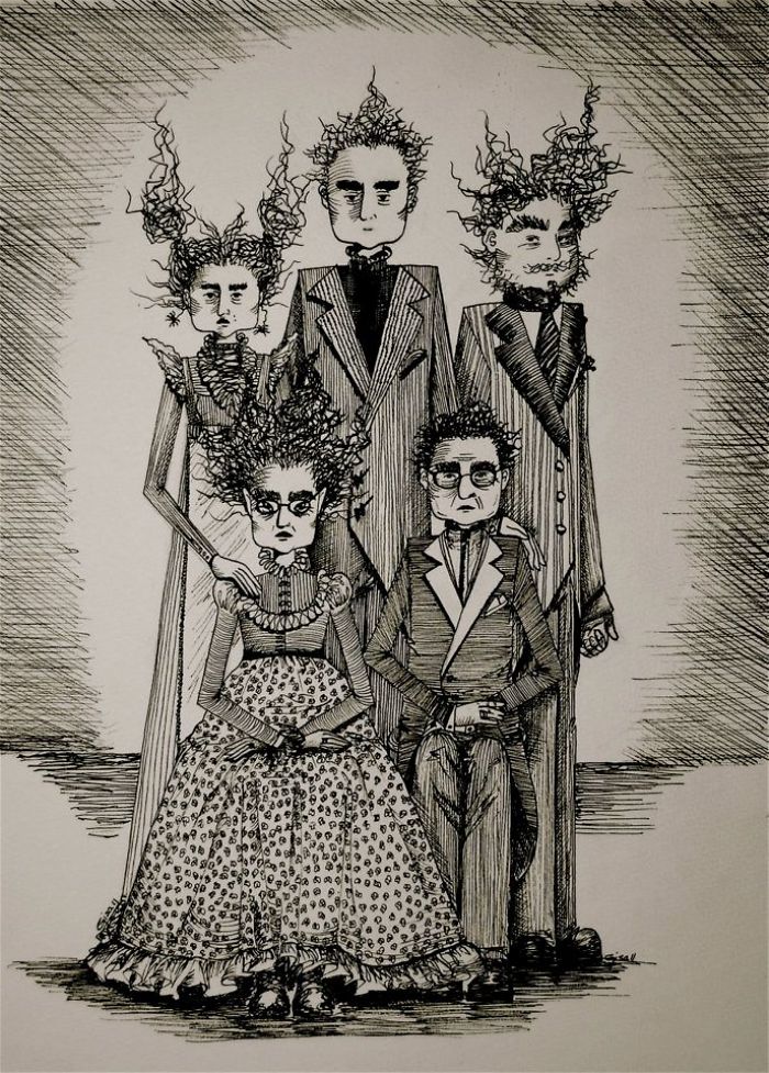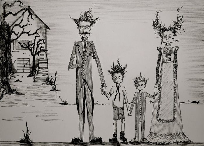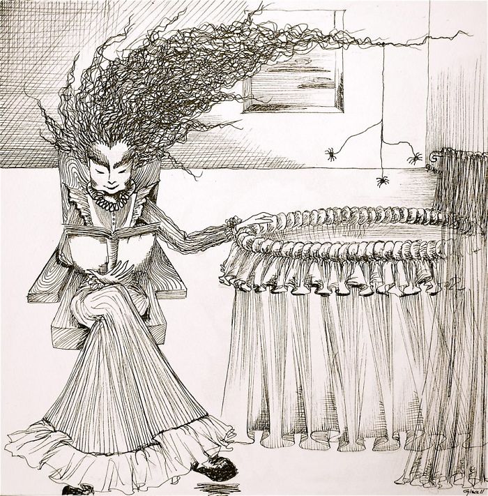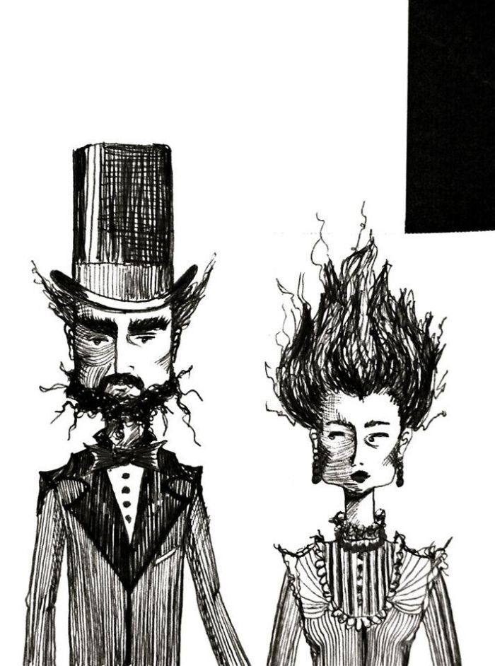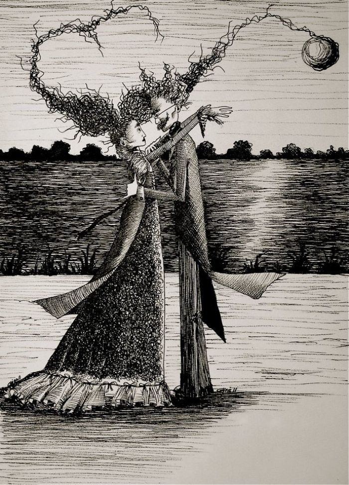 A few years ago, during the month of October, gisele teixeira sketched a little couple on a small piece of paper. Almost like doodling, the drawing took life and she named it “Love”. A few days later, while awake in the late hours of the night, She started another scene…and named it “Lure”. Enjoying the “L” theme, and how drawing was better thank lying awake in bed, She decided to call them scenes 1, and 2…and decided I needed 10 of them, all to be completed in the month of October. She is a big fan of Edward Gorey and Edgar Allan Poe, who clearly influenced her drawings.