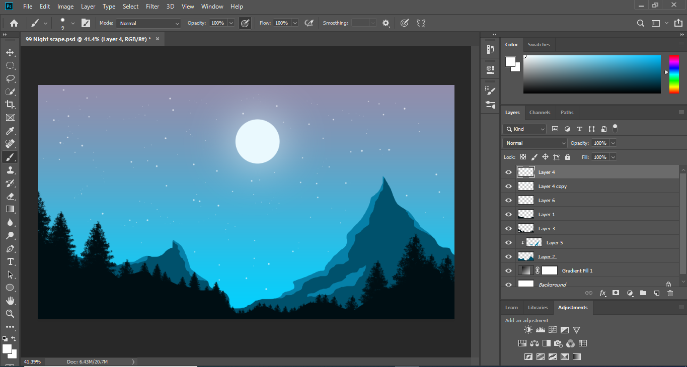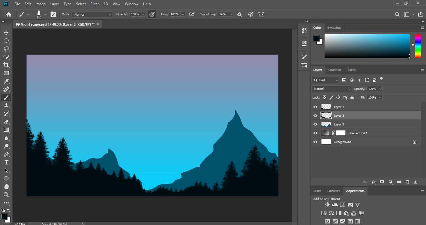 এবার নতুন একটি লেয়ার খুলে পিছনে পাহাড় একে দেই। সেগুলো একটু উজ্জ্বল নীল রঙ দিয়ে ভরাট করি।