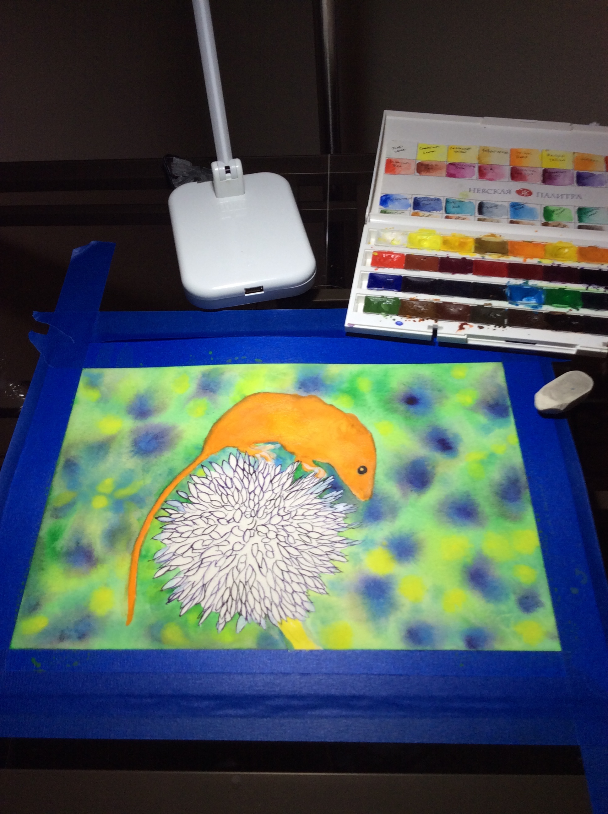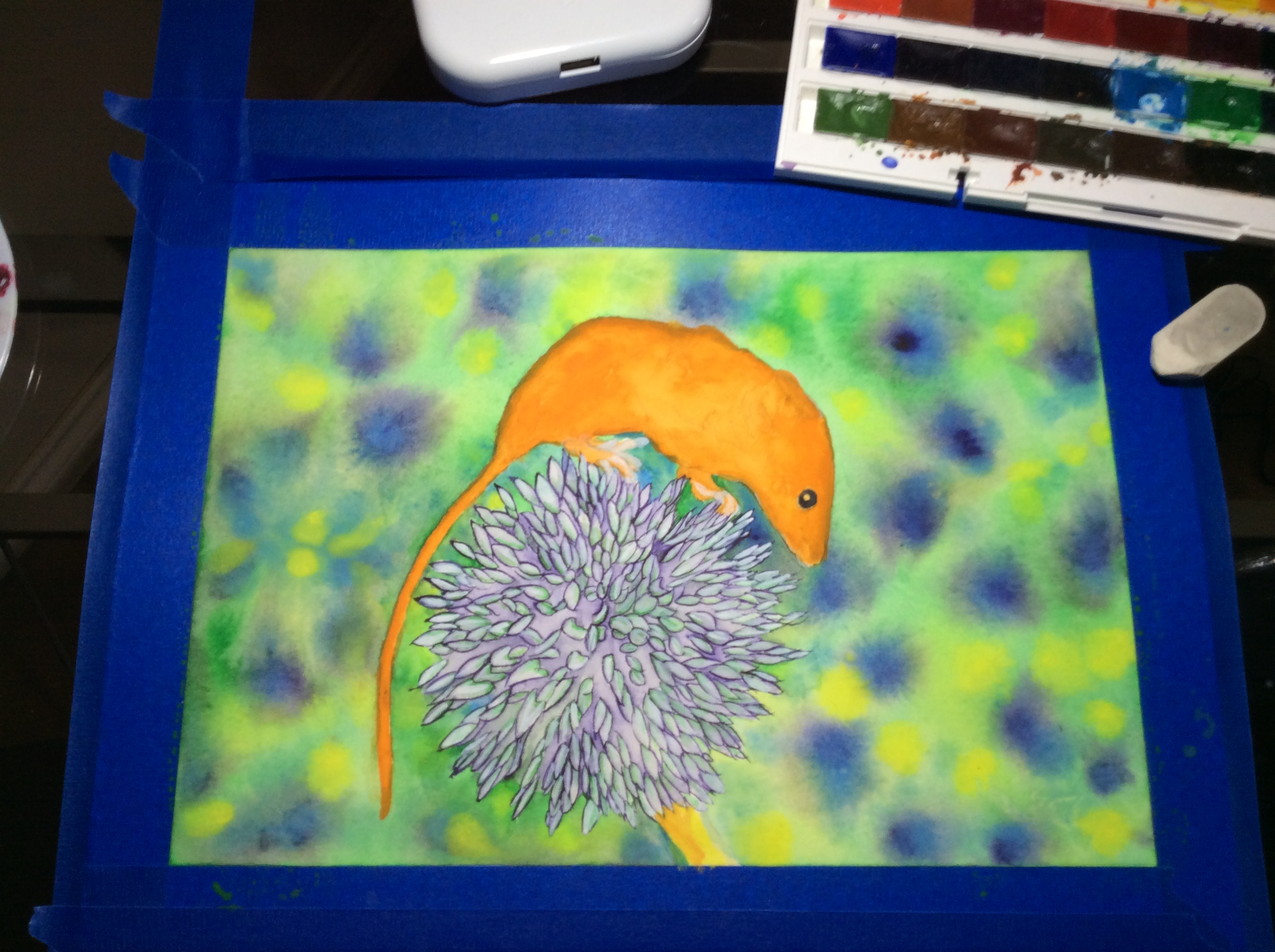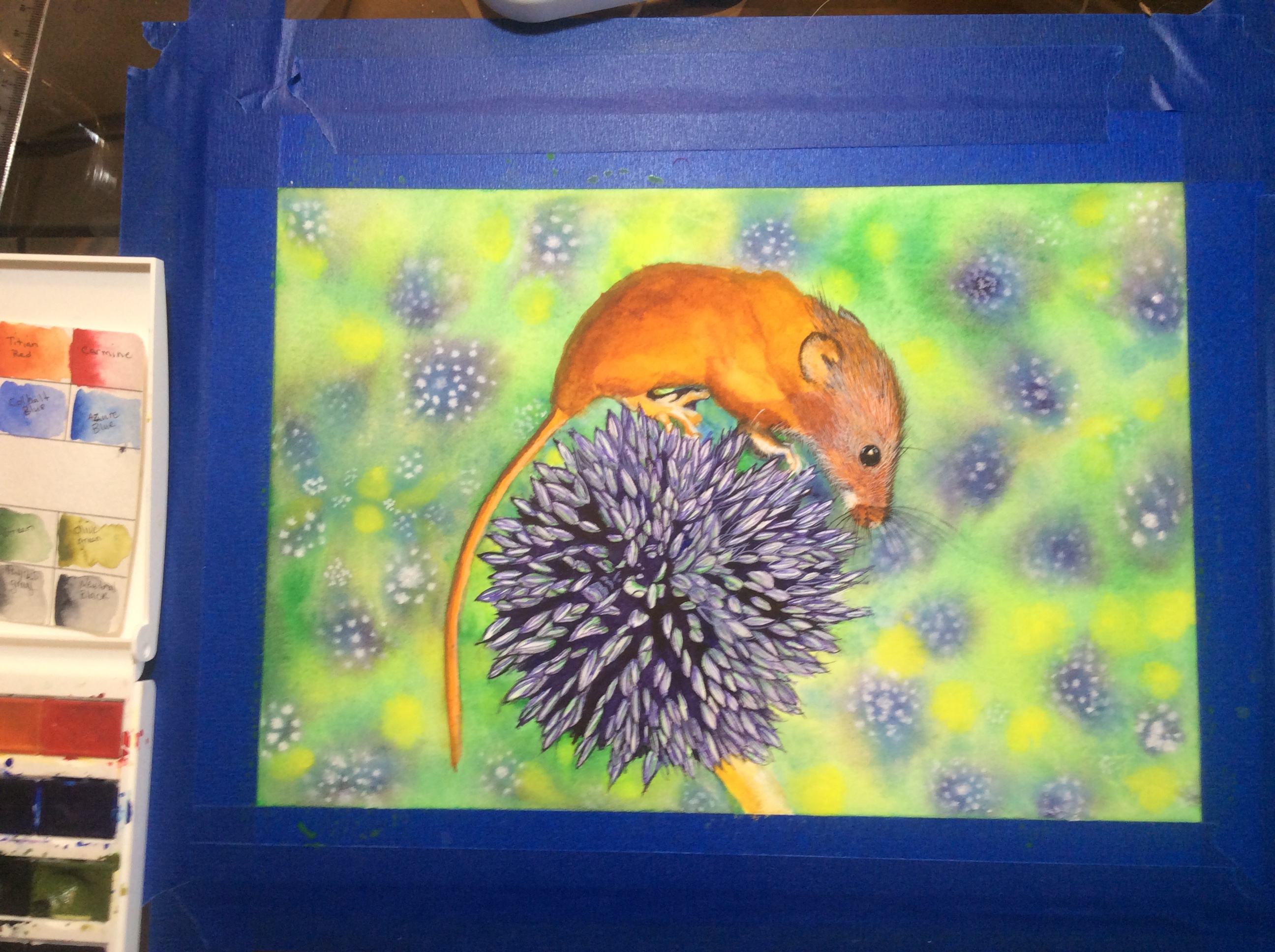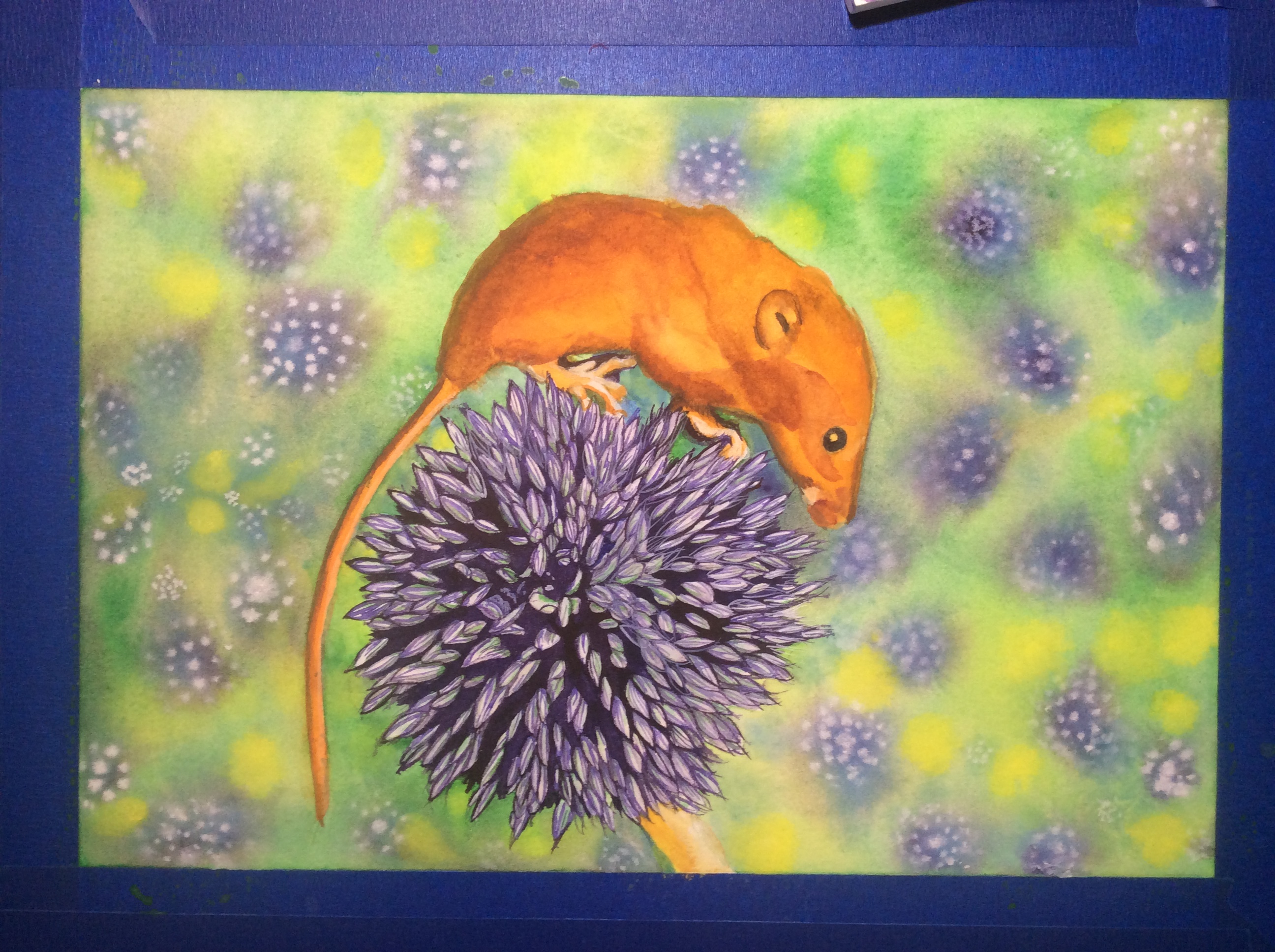 I am on my fourth layer of paint, the fourth layer usually consists of details. The first layer is the base color, the second layer is giving some mass using shadow and contrasting colors. Now it's time for adding hair to the mouse and details to the leek blossom.