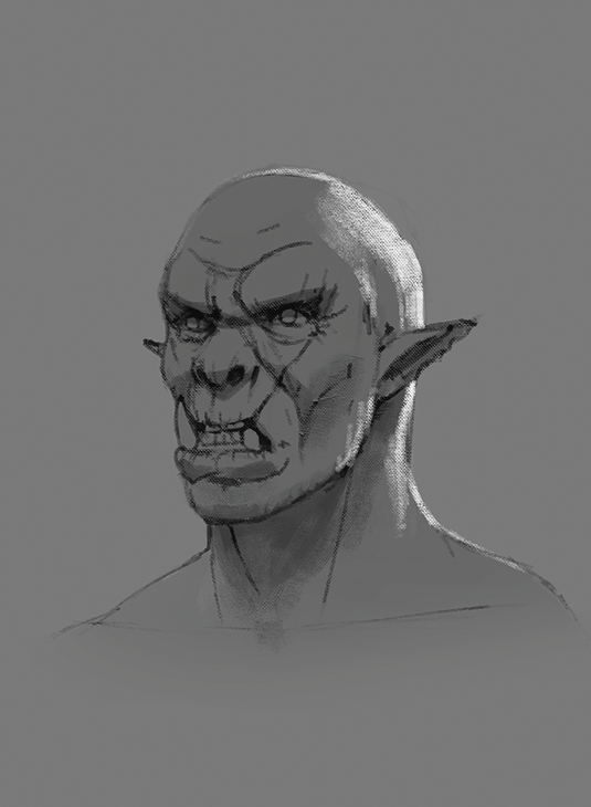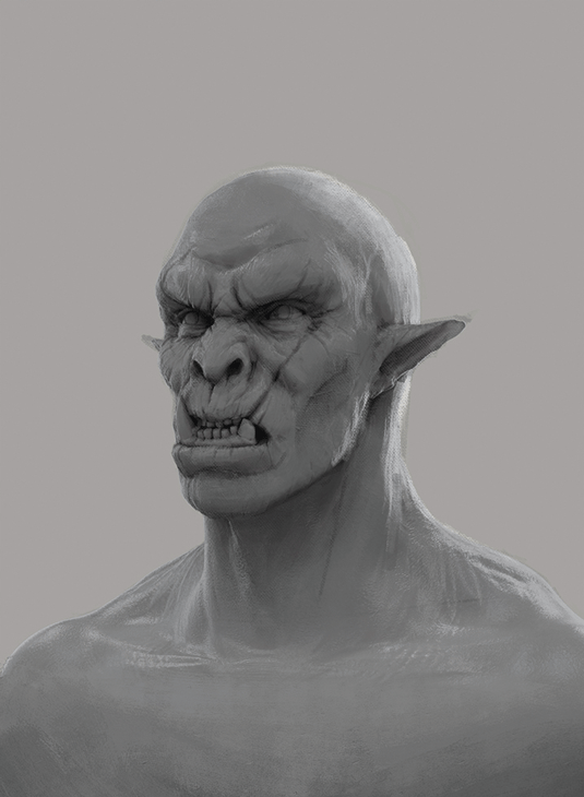 Built upon the previous sketch is that the occlusion layer. you will notice that it is a terribly bright layer with light-weight grayish tones in it, and therefore the reason for that's that we do not wish to do the shadows within the image. By keeping this layer light-weight the Multiply layer will not 'burn' my friendly-looking orc character below.