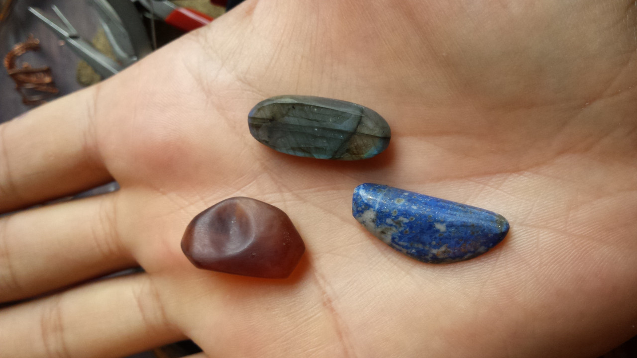 A piece of amber, lapis, and labradorite all cut and polished from rough.
