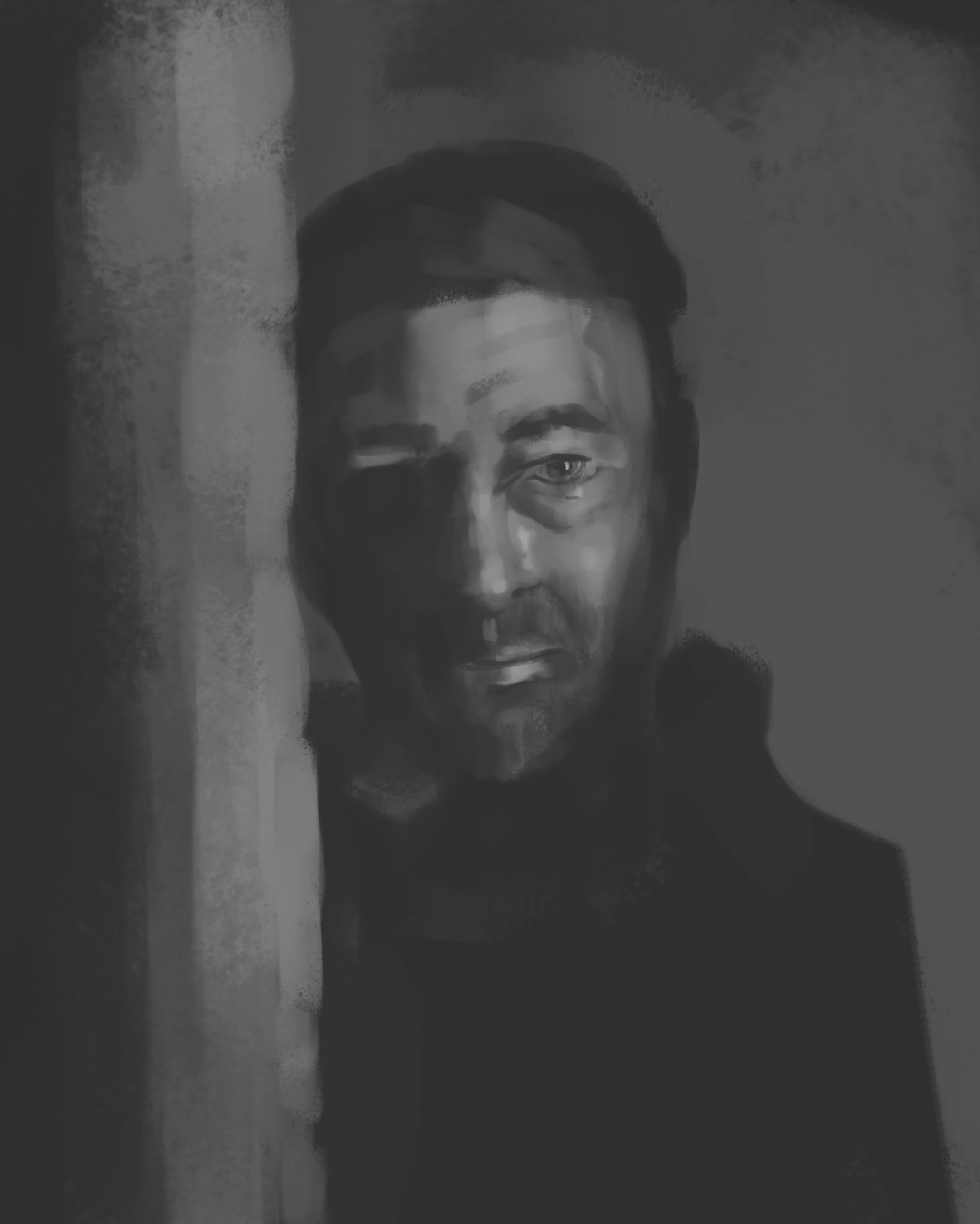 Looks like a weird combo of a painting and a digital photograph. I'm guessing a digital photograph with photoshop painting over the top of it. In any case, it looks kind of nice. Moody. And I think that might be what you're going for, so.. it works out.