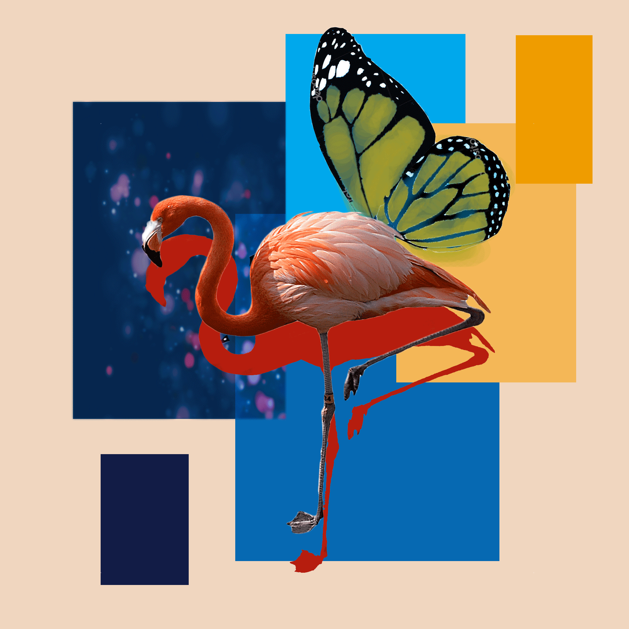 flamingo con las alas de mariposa: demuestran que la realidad puede ser alterada sin embargo podemos tomarla con buenos ojos, pues los rectangulos detras transmiten tranquilidad, esa tranquilidad que el subconsiente te susurra al oido...