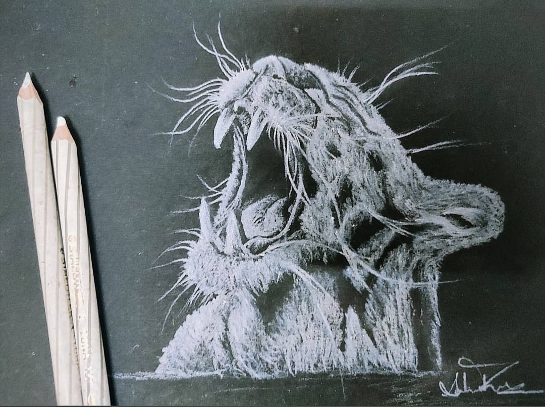 Roarrr!sahiba-rana (51)in #art • 6 years ago (edited) My first attempt of white on black. Color used- white shades pencil color of staedtler. base- black cartridge sheet. Hope you guys might like it. #onchainart #ocd #gems #powerhousecreatives #india #art-venture