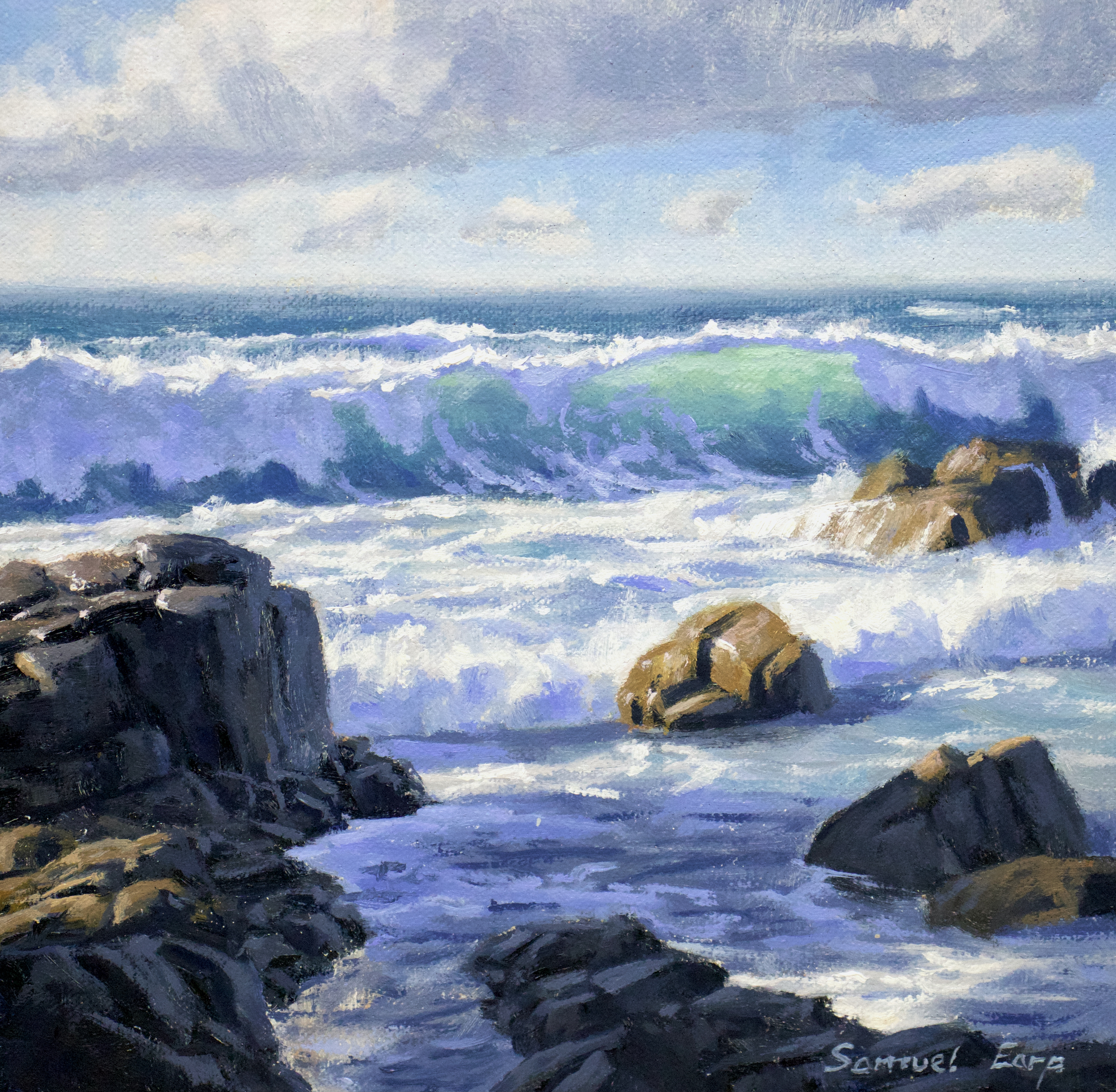This painting is inspired by the wild sea around the coast of the island of Guernsey. I painted this art work in oils on an 8" x 8" linen panel