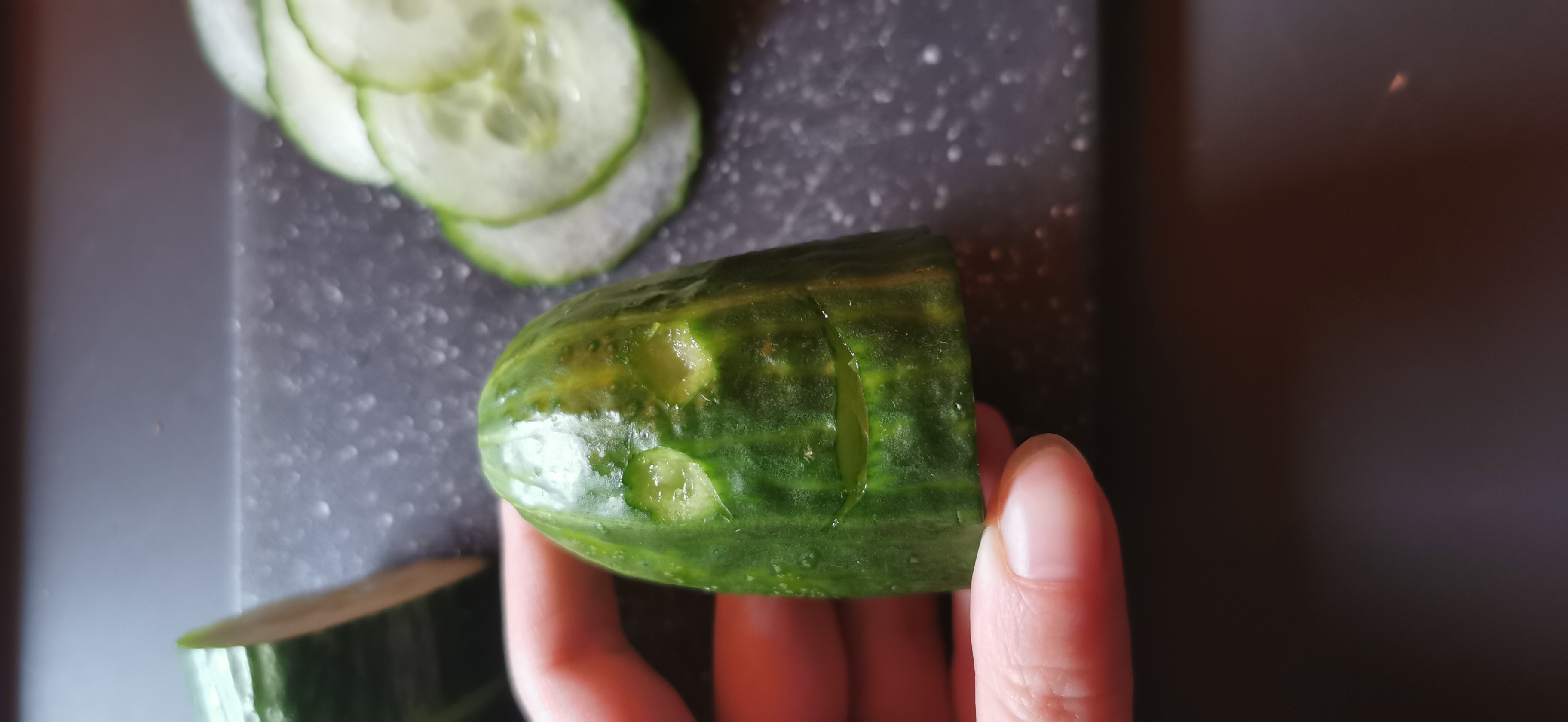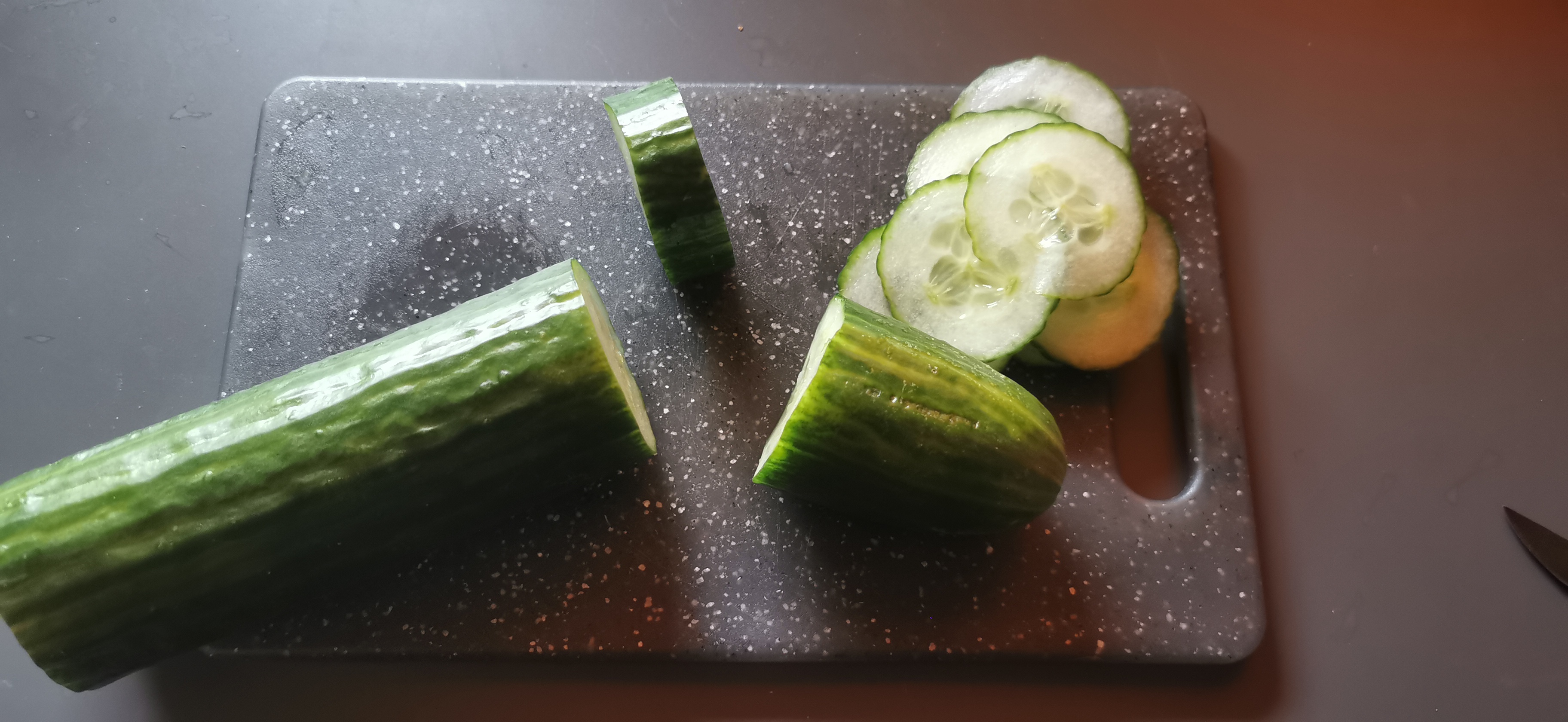 First, I cut the cucumber into several pieces. In addition to large chunks, I also needed thin slices.