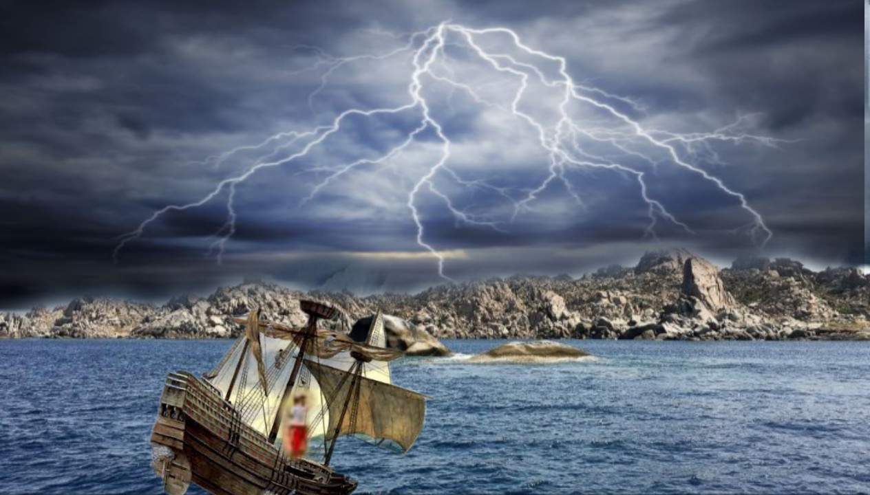 In the image created by me there is a ship in the water and accidentally climate is changed. There is a storm coming and lightening in the sky. 🌊🌪⚡