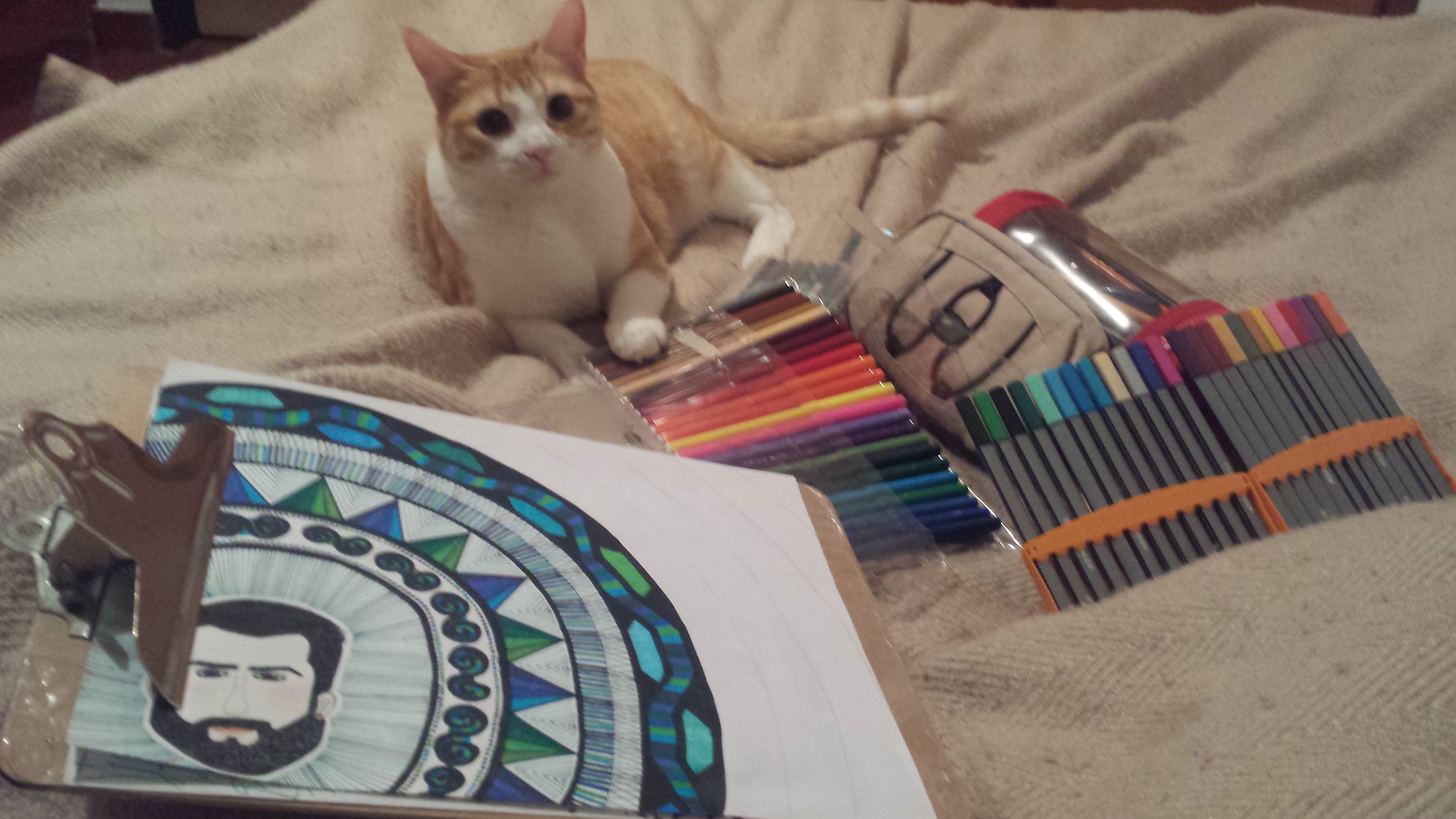 Él es Julián y siempre está conmigo, de hecho ésta dormido en mis pies en éste momento, también queda en evidencia el material que utilizo para hacer mis dibujos; son simples marcadores con dos tipos de punta