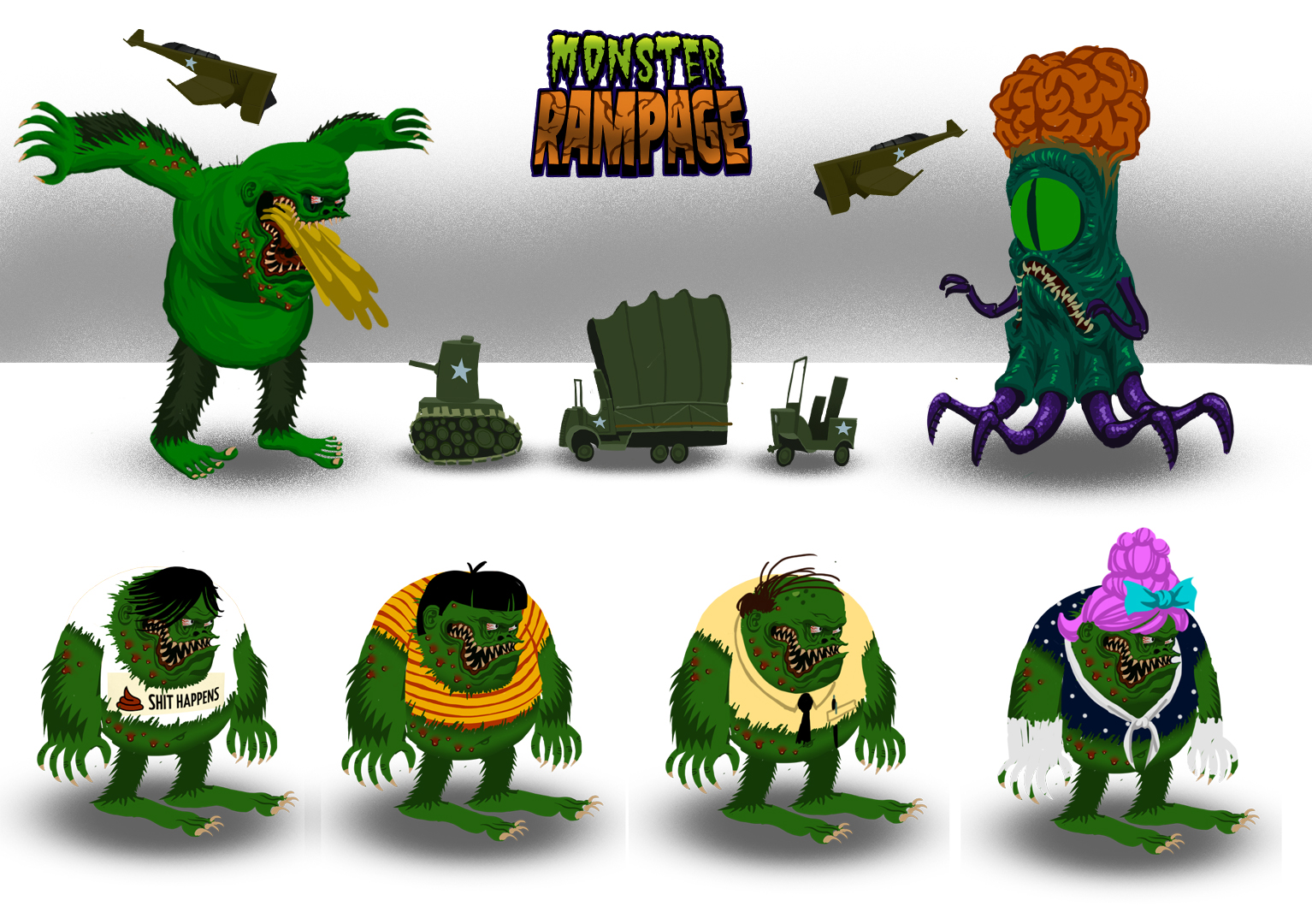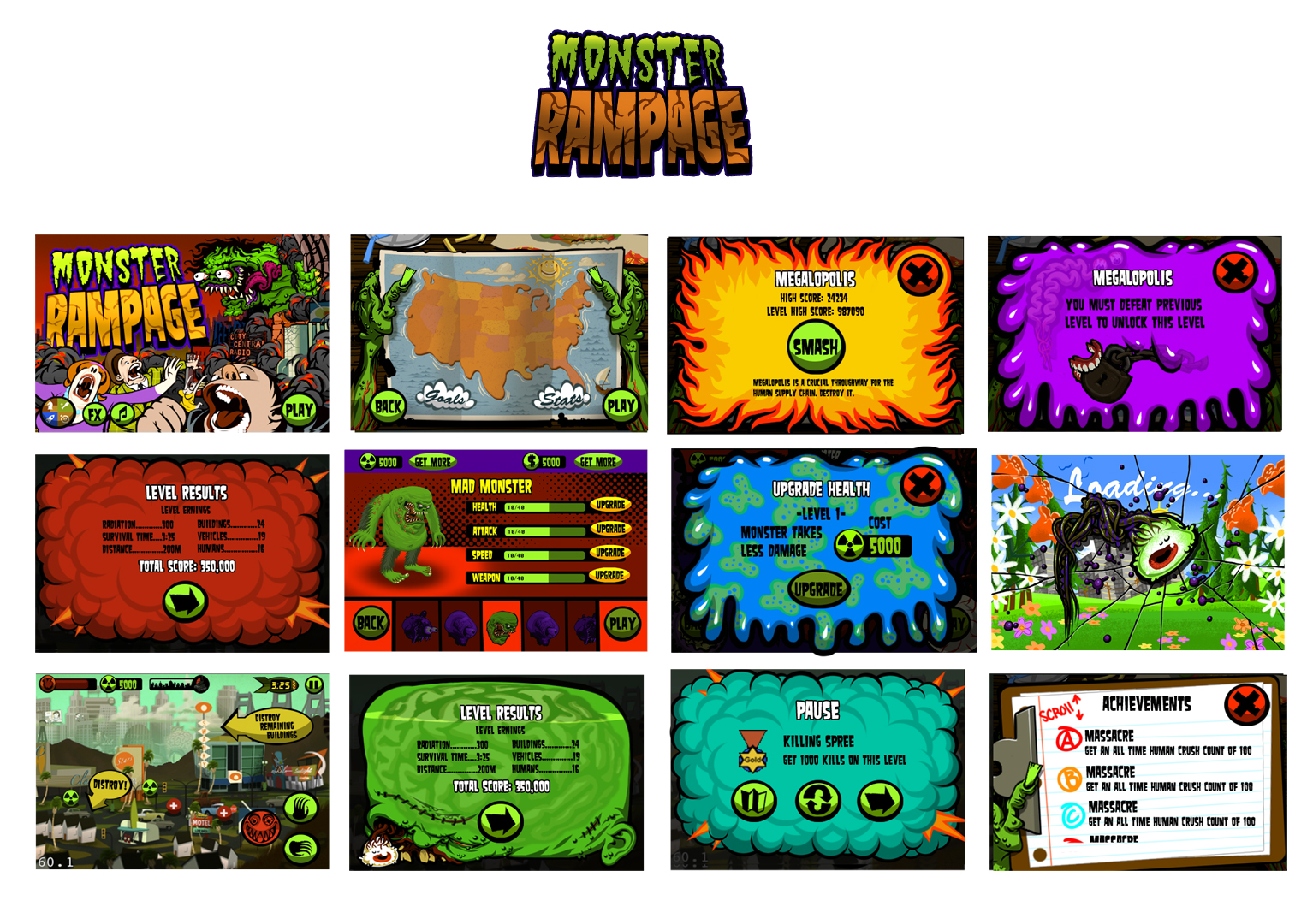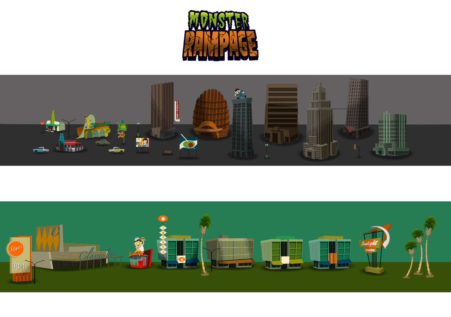 This is another mobile game I worked on that never got released. Was supposed to be a pretty simple runner where you run through environments destroying buildings in this super quaint 50's style world. I really liked this premise because I was able to reference some elements of skate culture and things to push the feel. You might be able to see I'm dealing with many design restrictions for this type of project. That's definitely a big aspect of being professional, sure you can draw really well but now see how you do if we dump hot sauce in your eyes and tie your hands behind your back.