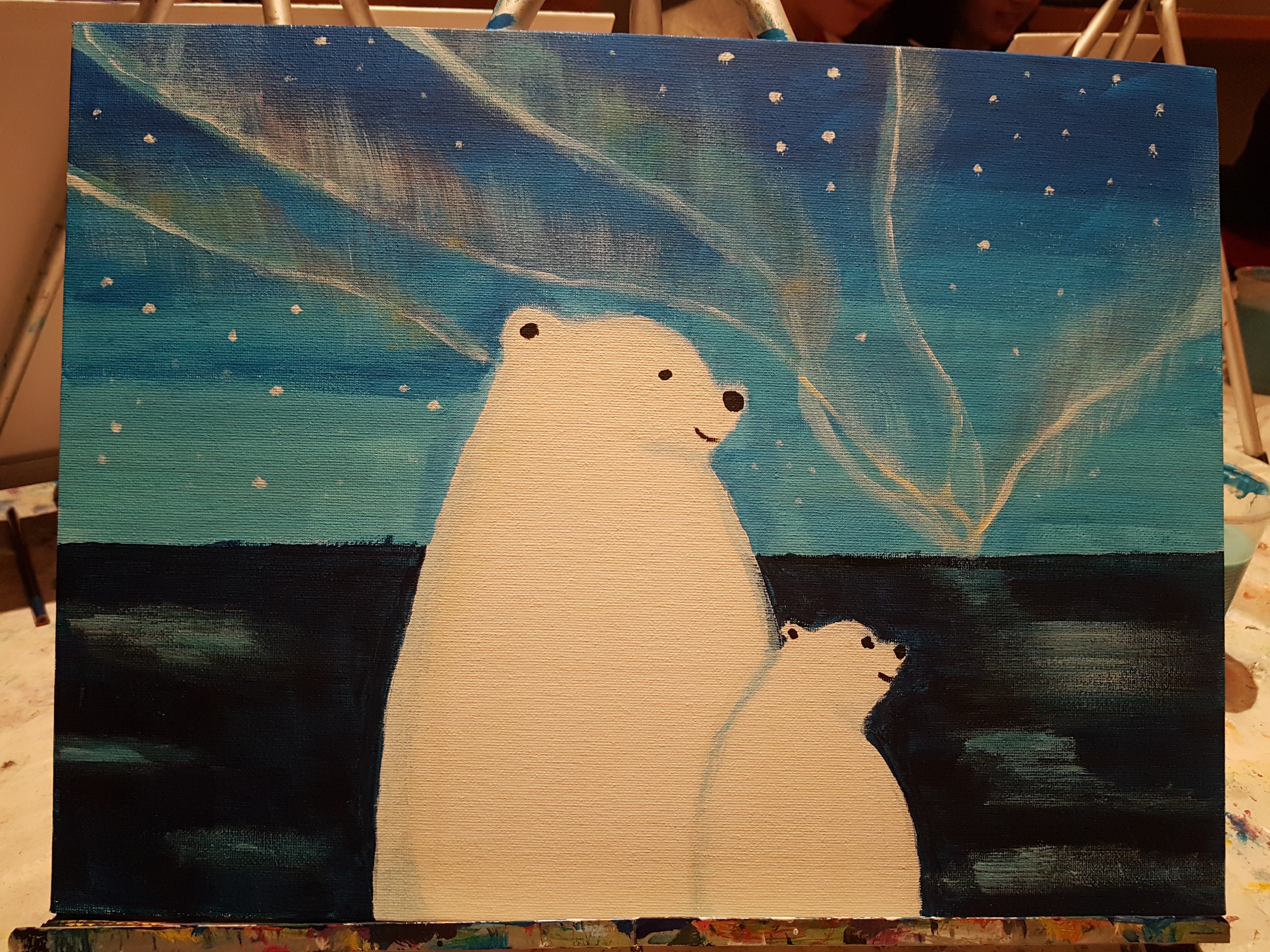 Tonight I went to a 2 hour painting session with Life with Paint. This was my first time painting with a class like this. Unfortunately it was too crowded and the teacher didn't really know how to teach so I was a bit disappointed. I really like northern lights and animals so when I saw they had this painting I decided to sign up to learn how to paint it.