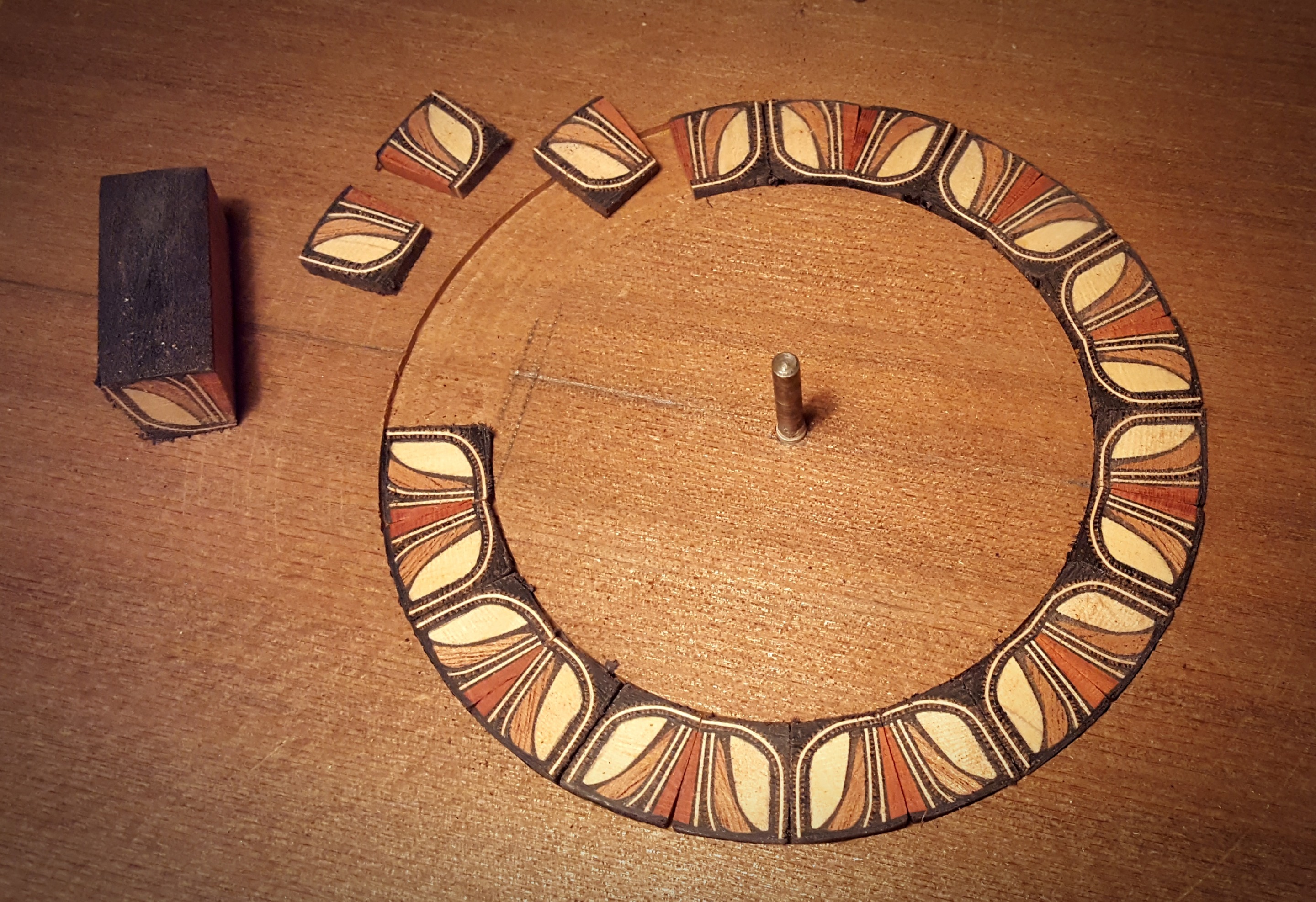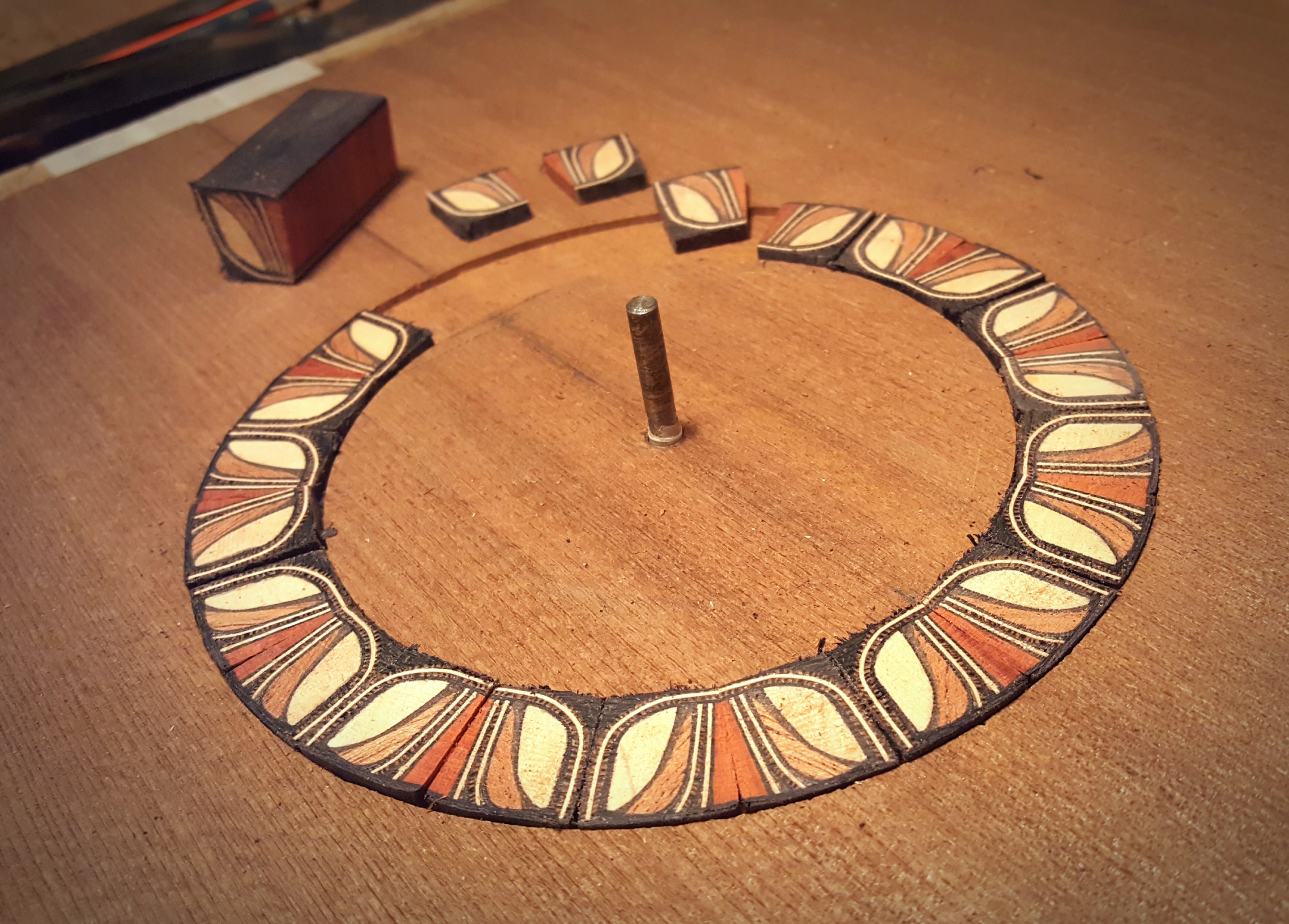 This one is made from cypress, mahogany and padouk offcuts and various wood veneers. It took me hours to get all the pieces in place because I kept on getting hypnotised by it every time I added another tile.