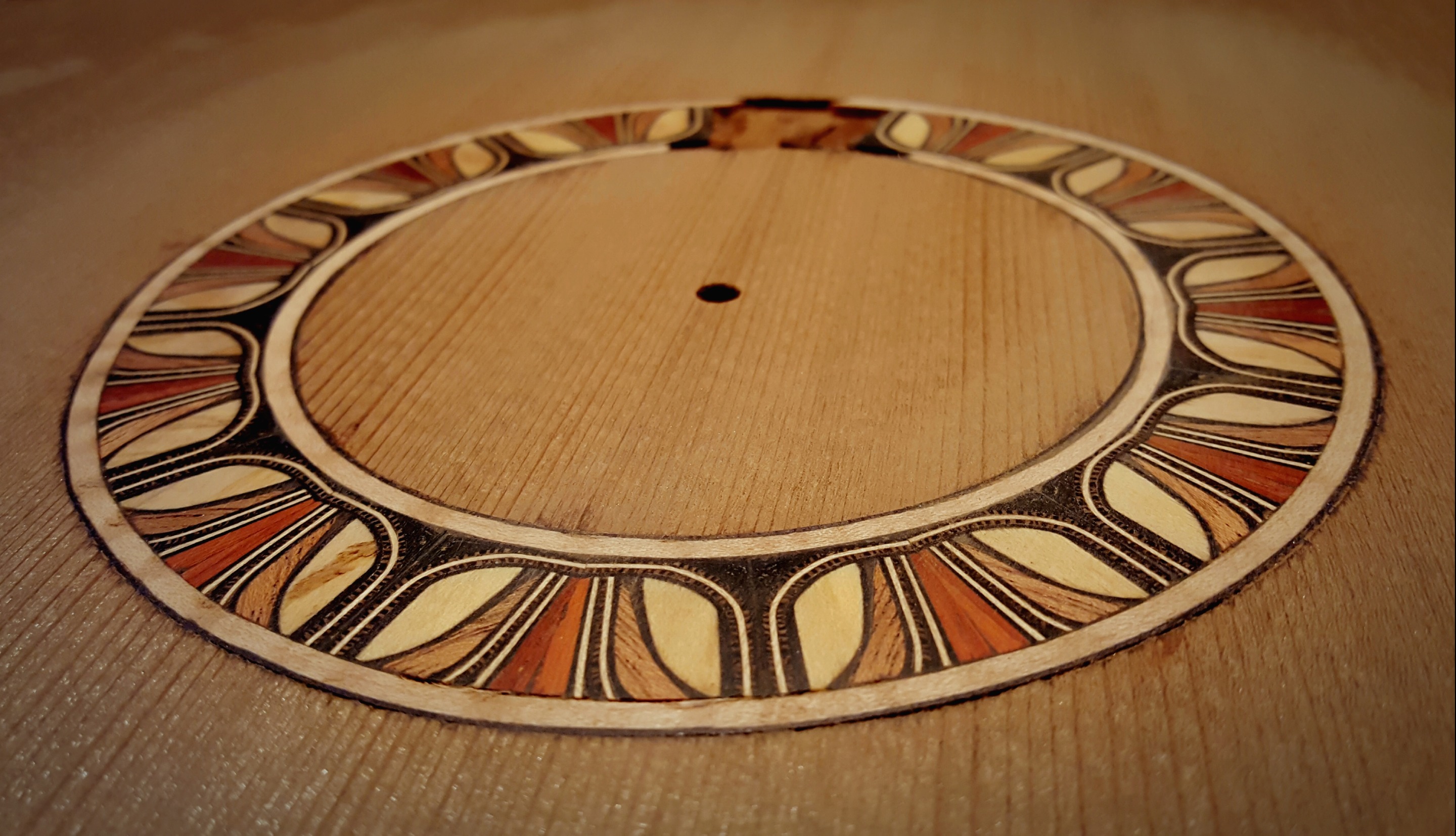 A good, quiet night for inlaying the soundhole rosette into this old redwood soundboard...