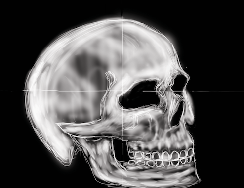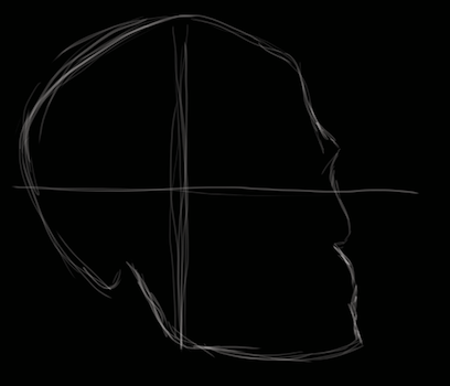 On this drawing practice, I decide to go with a simple skull in a semi-profile position. This ads a bit of a challenge because you no longer have symmetry as when drawing a frontal, and you don't have the "flatness" of a straight profile position. I used photoshop using only two layers. The bottom layer was all black, and the layer on top was where I would paint in white or erase. I usually had my paint brushes and the eraser with the flow or output as much less than 100%.