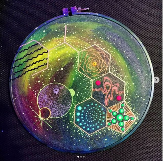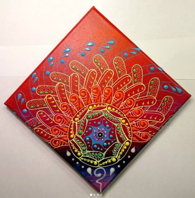 I never have a clear mental picture of what I'm going for; often the background colors, patterns and textures guide my first stroke. That stroke in turn tells me where the next line or dot will be. I don't always feel in control of what happens and that's why I used the word magic earlier. I honestly feel that the creative ability I have is beyond my understanding of how it works.