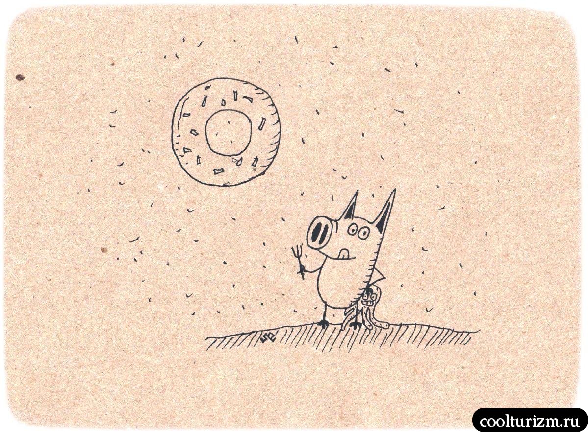 When the Donut Moon is waning, Svinni experiences anxiety, feeling like someone is constantly stealing his donut in the most brazen way! How can that be?! But when the waxing Donut Moon appears in the sky, Svinny is overjoyed, because the Donut Moon's course is growing day by day, and that's good, even wonderful! The more donuts, the merrier!