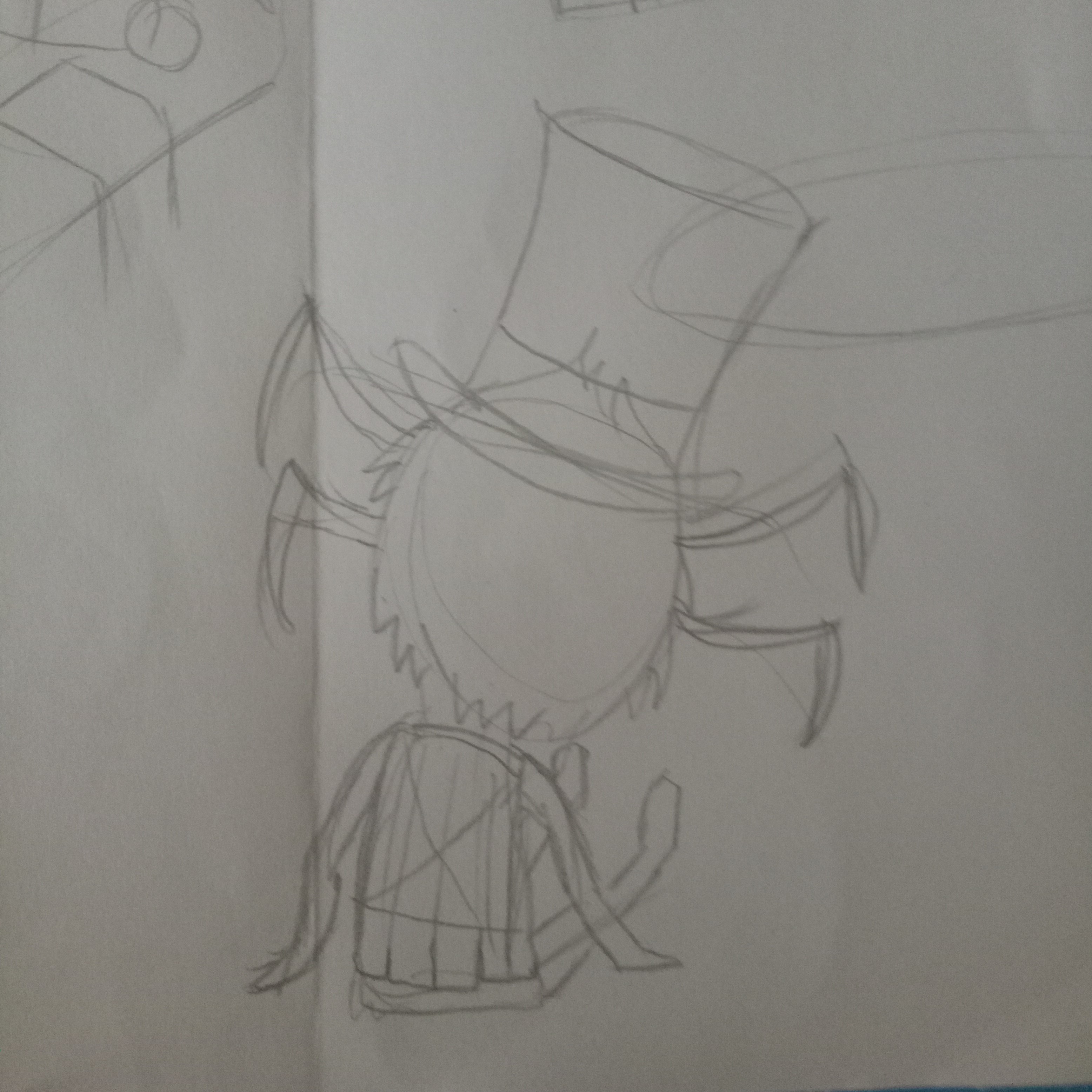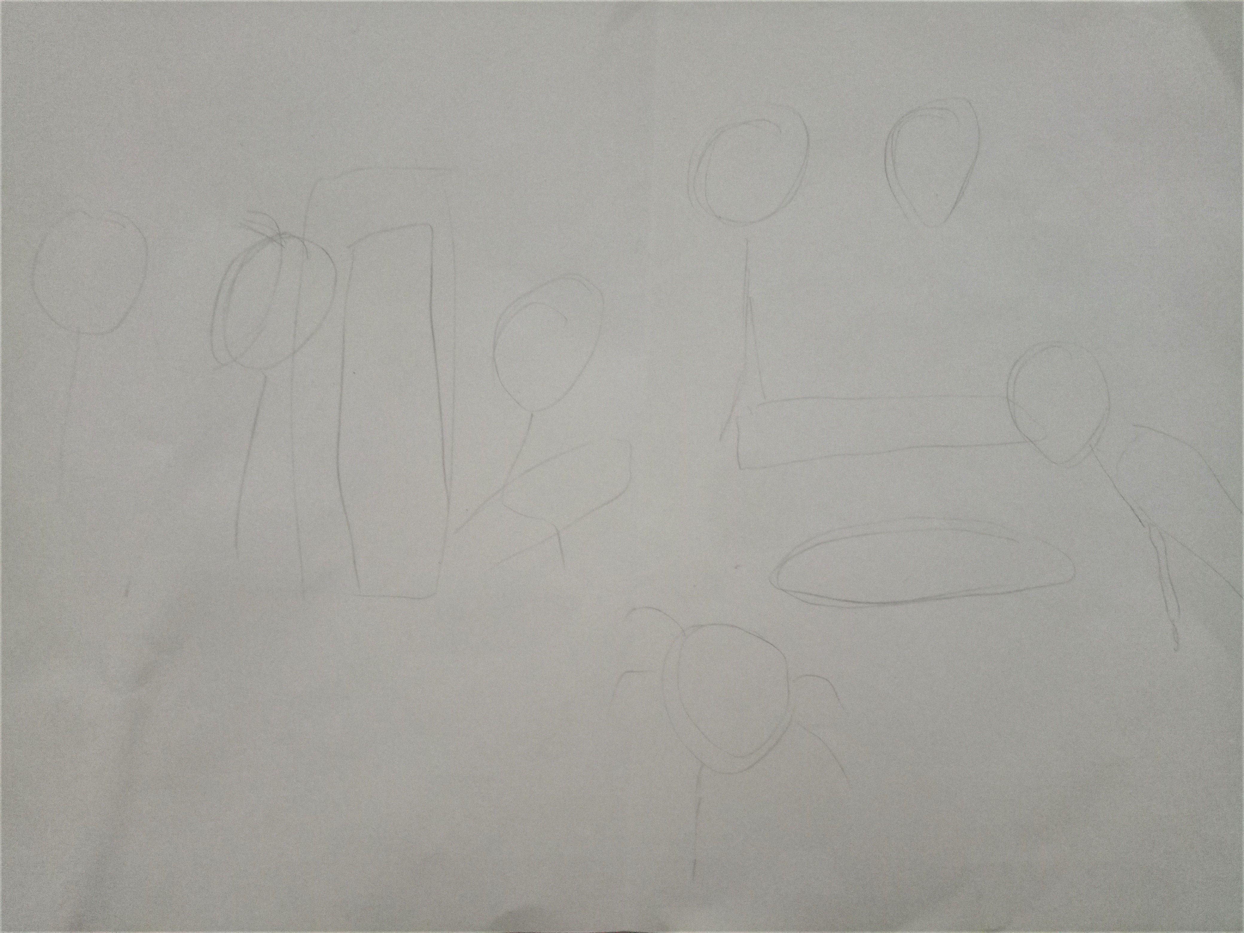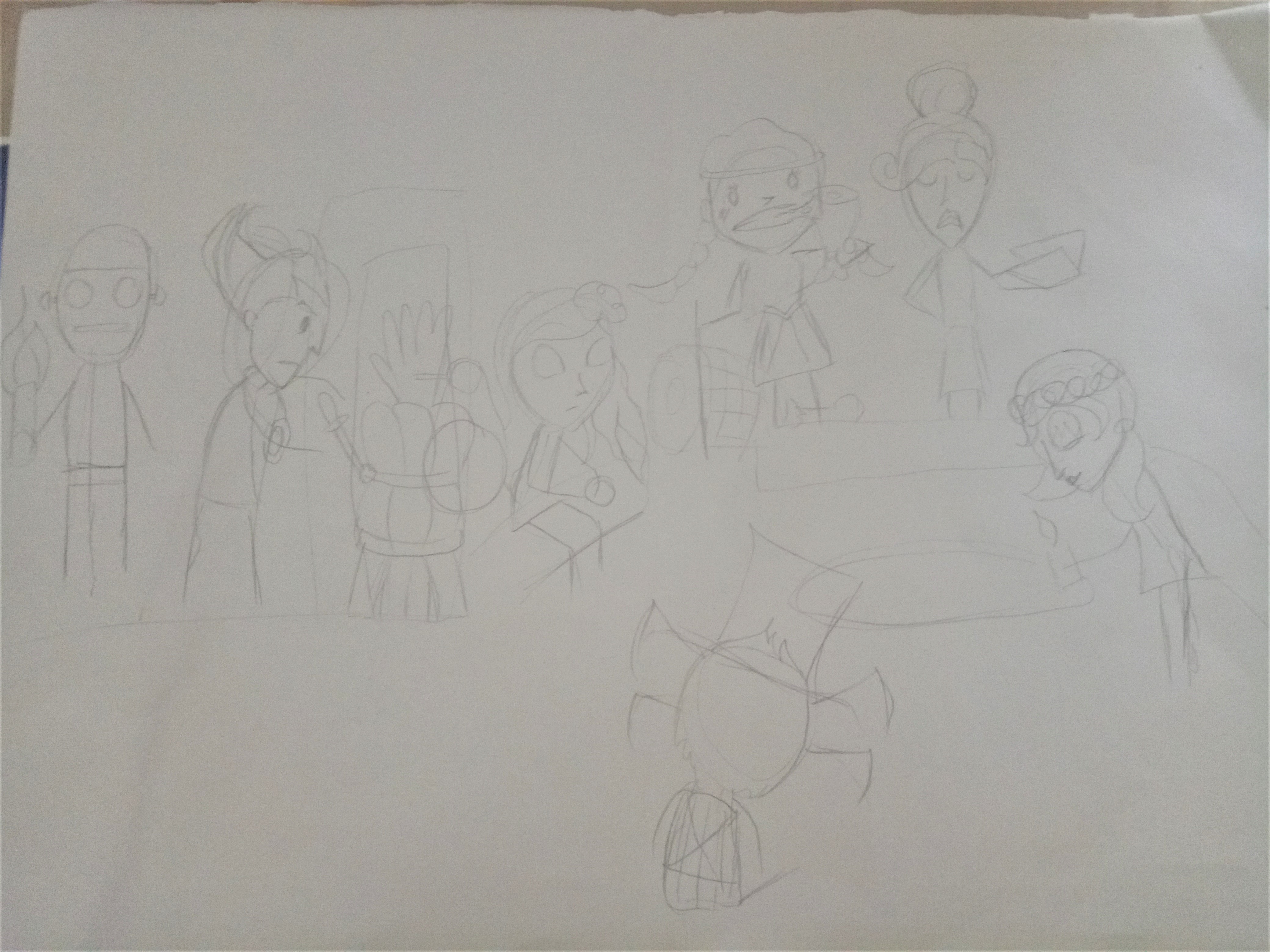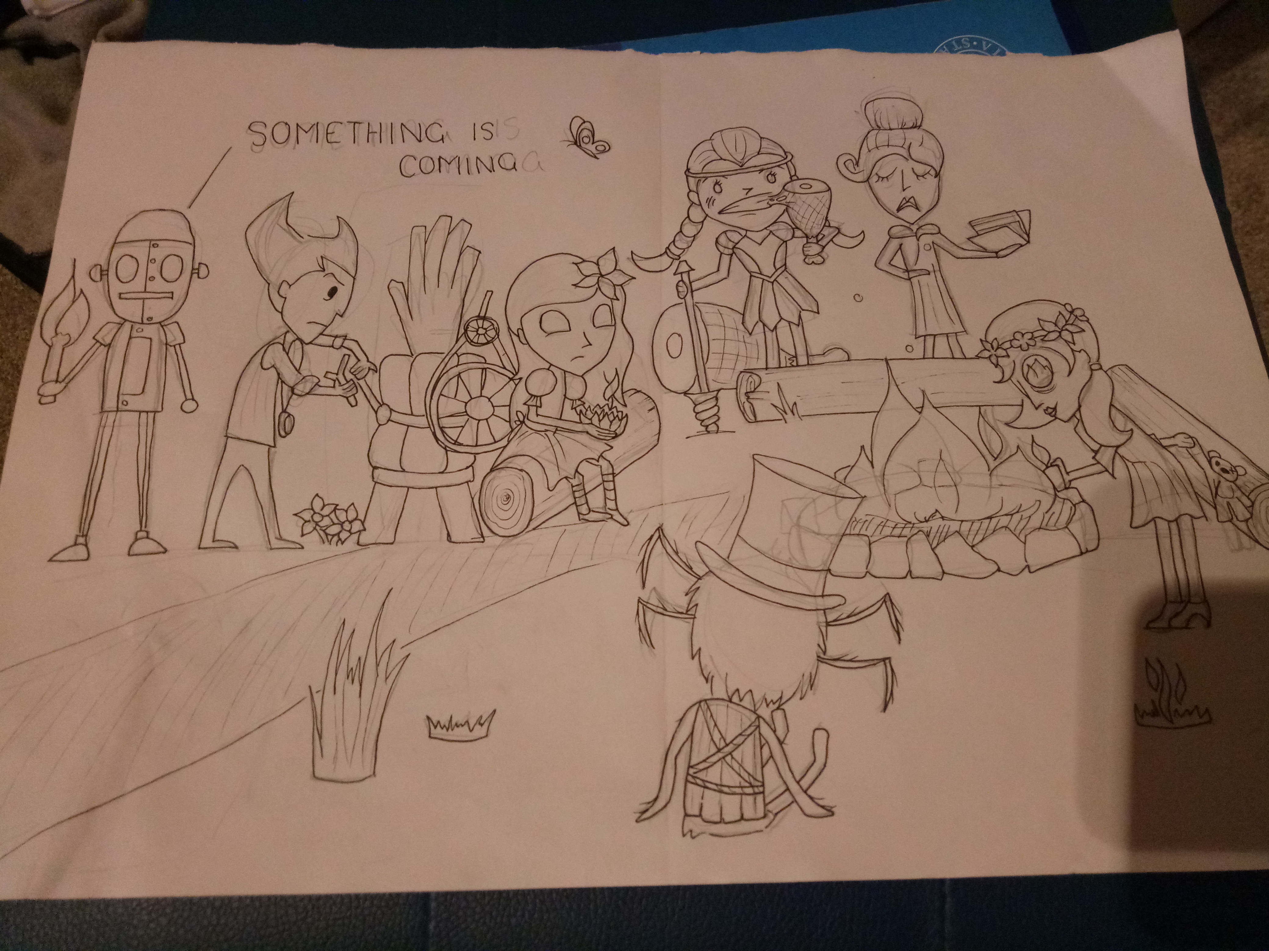 I usually have an idea of what kind of scene I want to draw before I start. In this case I knew I wanted all 7 characters, with WX-78 warning them of a hound attack. I drew 7 heads and tried to position them around a fireplace.