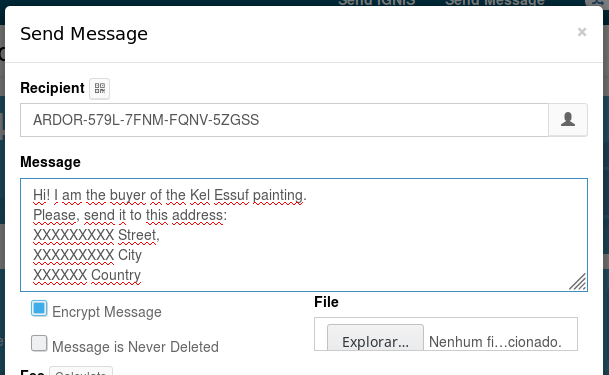 As explained, the participants in the auction are anonymous. However, to send the real work the artist needs to know the postal address to send it to. For this the buyer has to make it known by a means that proves that he is the buyer of the token, and not another person supplanting him. It is easy to do this in Ardor, since it has the Messaging function integrated. Thus, the new token holder must send a message to the artist from his own Ardor account: