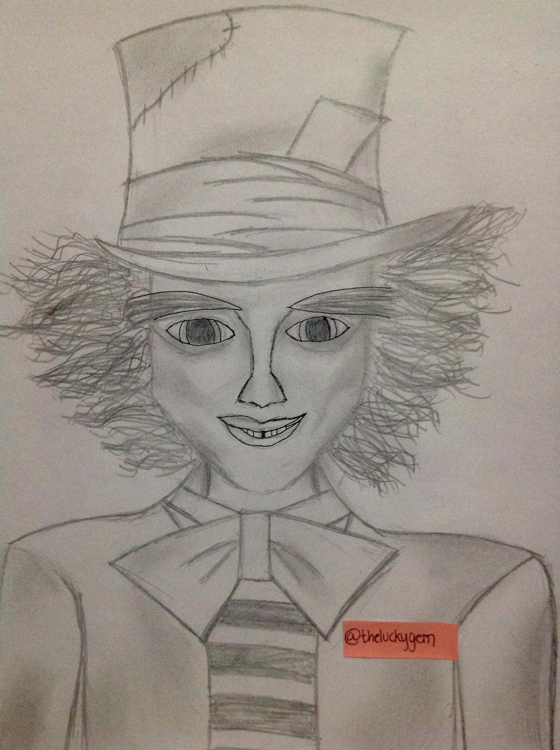 what i've drawn. I'm not good at drawing portraits but when i thought about the hat, i thought of mad hatter, a character in alice in wonderland. so i drew mad hatter (even if he doesn't look like, ok maybe a little hahaha)