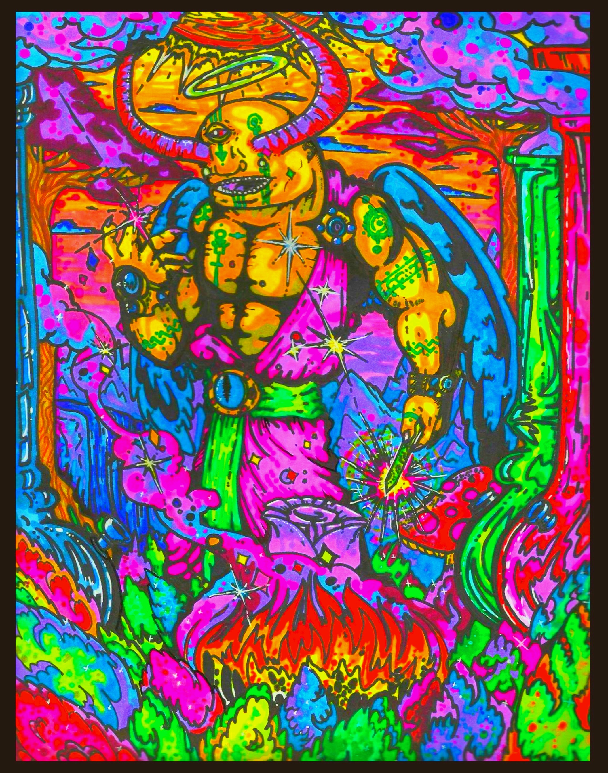 Khannaburos is the herald of all inspiration. When he speaks his voice that of words and music. With him is his crystal wand named Pansoul,made out of the one of the bones of the universe,he constructs vivid landscapes and new creatures into his realm.