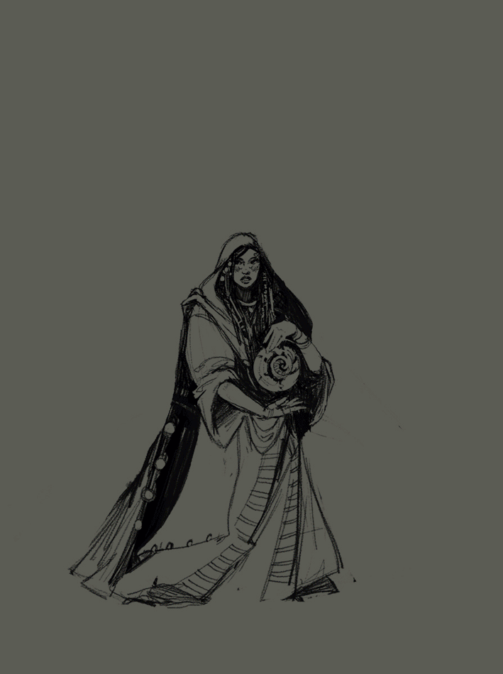 The princess is the true heir of the kingdom. While she thinks she is unworthy, she wants her people to be a peaceful and prosper civilization so she goes on a journey to seek help from other kingdoms and get back the throne from the Duke. Her floating mirror only reflects the image of people with great destiny. Anyone who confront the mirror and sees his reflection appear, can ask the Shell of Pallacià to predict their future. But the shell will only whisper to the Princess' ears... The whole theme of the princess is about self reflection & image. She'll always speak the truth since the Shell predicts the future. That's why she shows her face and does not wear a mask.