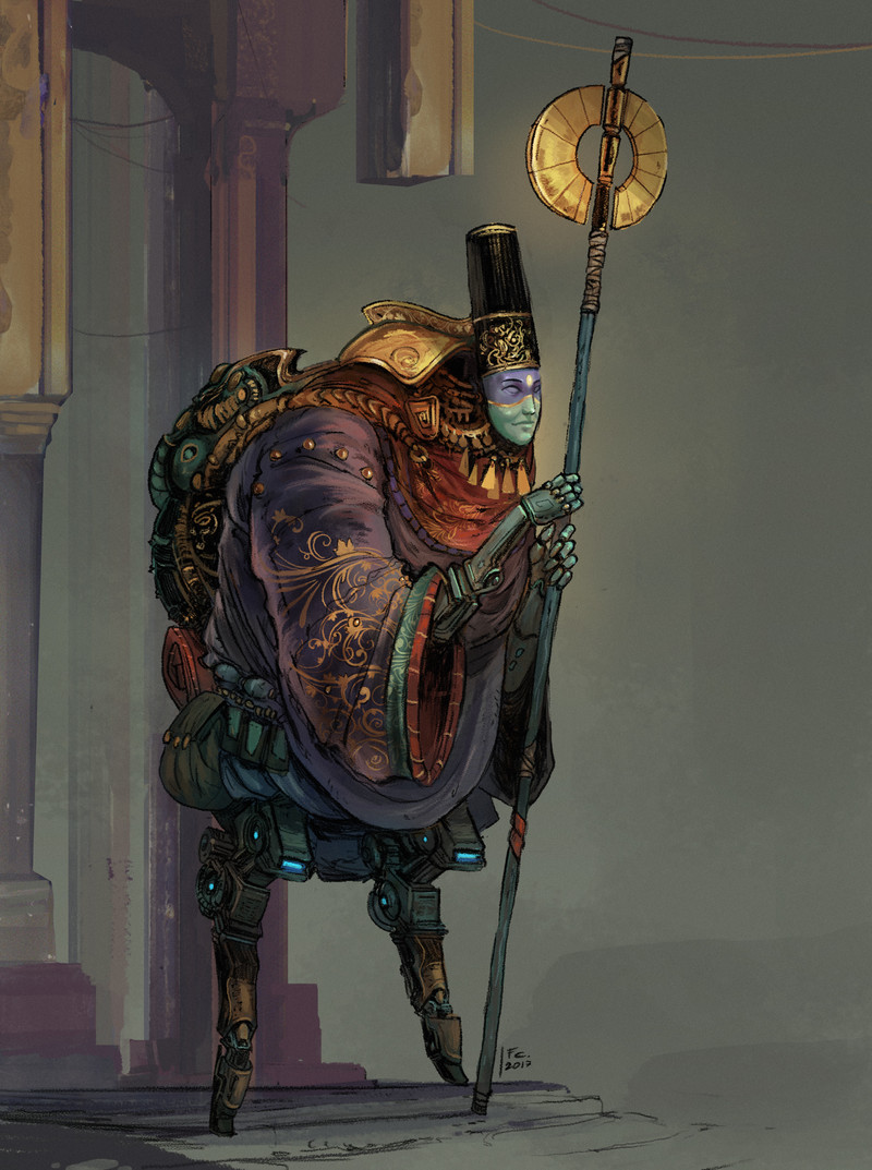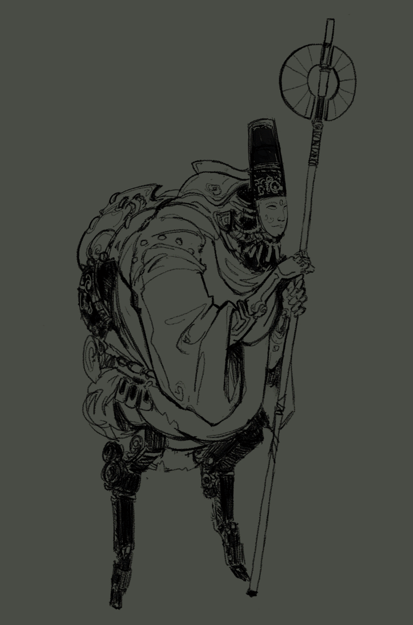A long time ago he was a wise priest and a faithful advisor to the previous king. His conscience was transferred in a gigantic robot when his body became to weak to keep existing. His mind has been altered and he's not completely the man he was before but a new entity. He has a colossal strength even if he looks peaceful he will do anything to protect the princes and help her in her journey