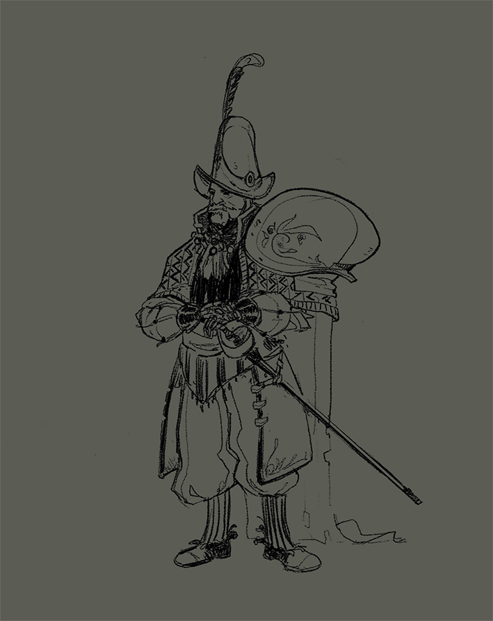 Sir Devozs likes is a bit old fashion. His design was directly inspired from Venetian guards. He doesn't like masks and enhancements; he rather be wounded than get a bio mechanic arm or be transferred in a mechanical body. He thinks machines are not humans anymore and he has little respect for them. However the princess and their journey will give him a different view of the world.