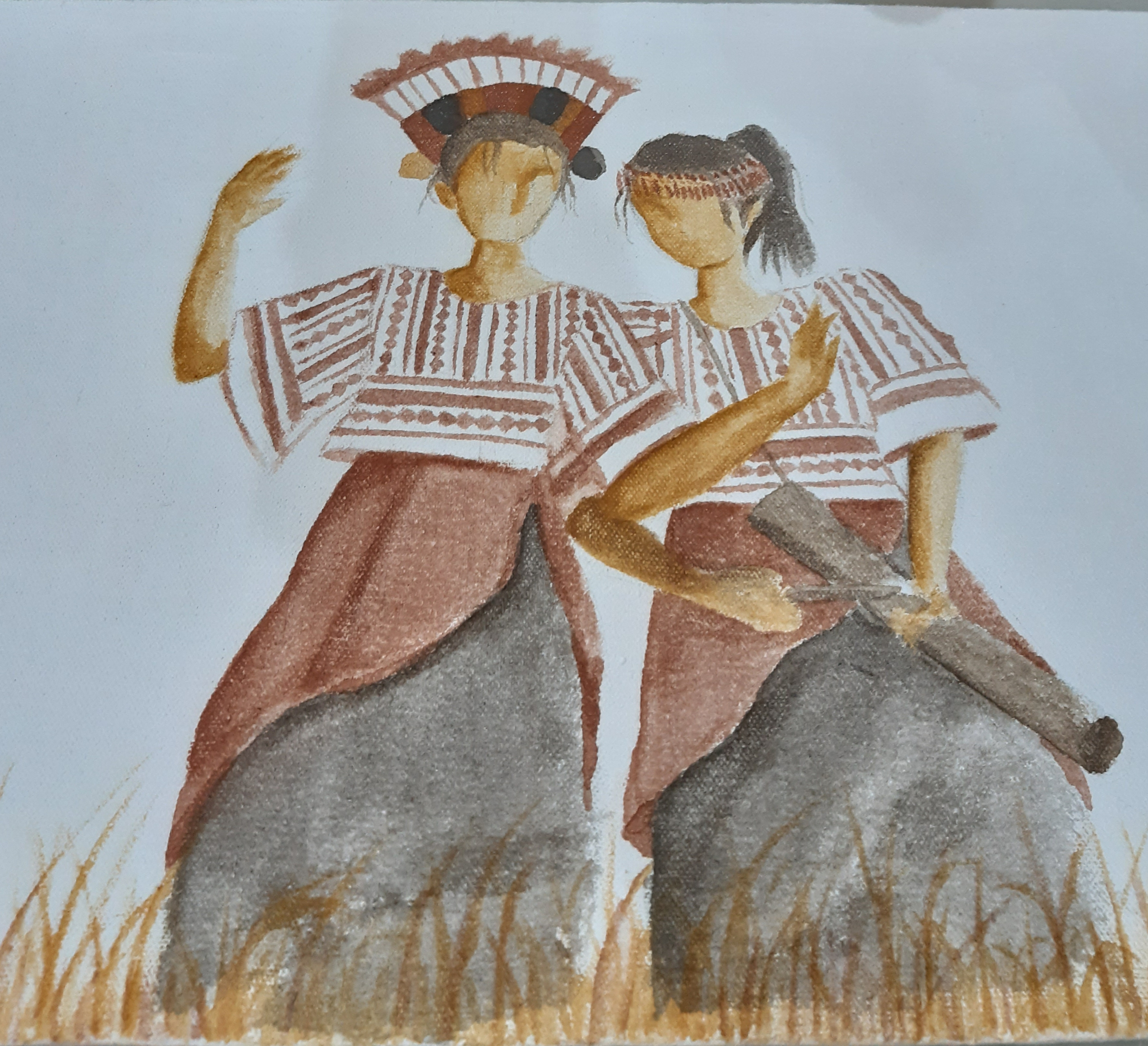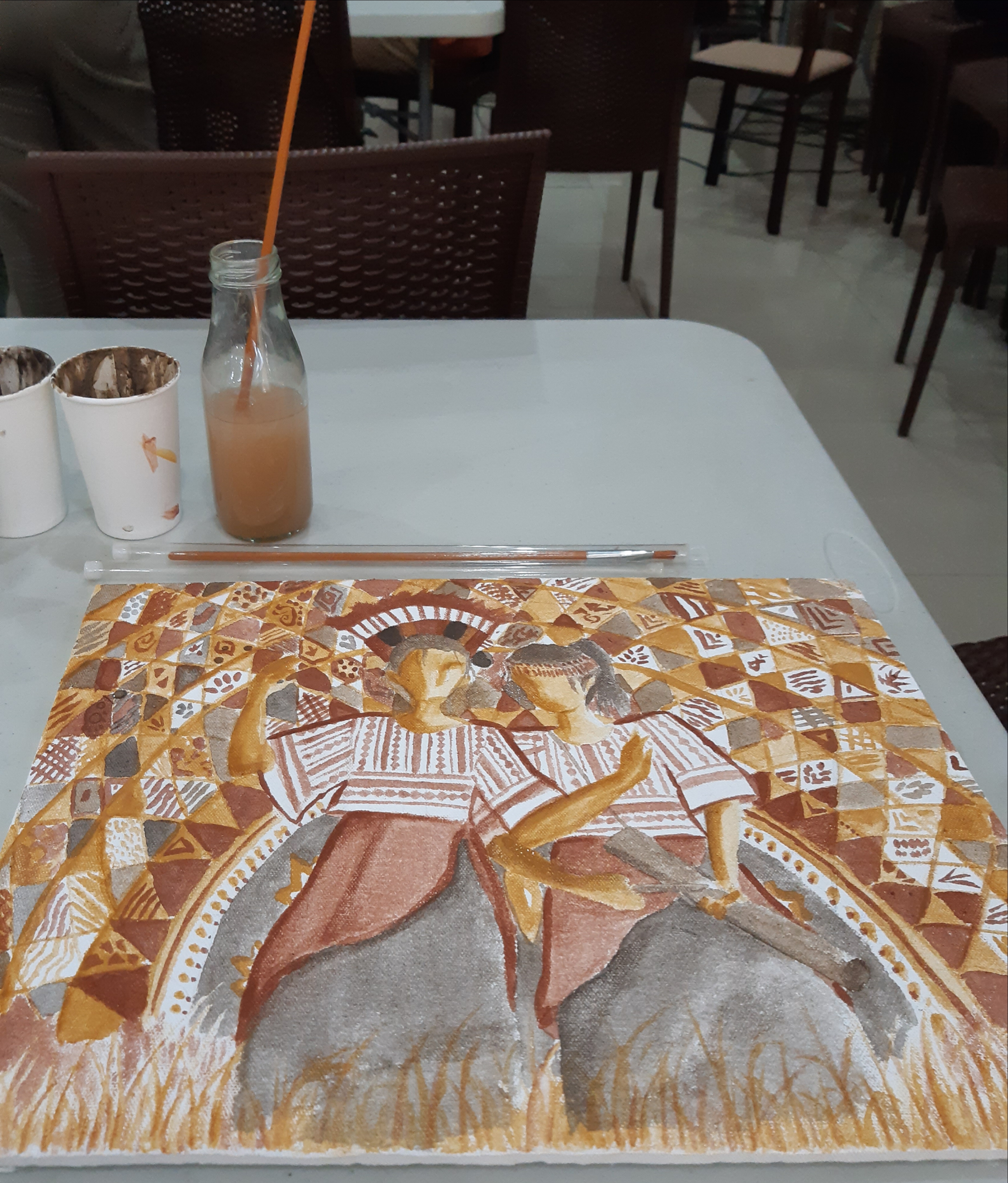 This was my artwork back in 2019 which I named sisters, this was created with a vision of women in their indigenouss clothes dancing and playing their handmade instrument, I tried painting the symbols and patterns that is associated with the clothes on the tribesmen that is behind the two figures. I wasn't planning on joining at first but to pass the oppurnity that was infront of me had made me feel uncomfortable when I thought of it. So there I joined in, did my best and for my first soil painting, it wasn't that bad.