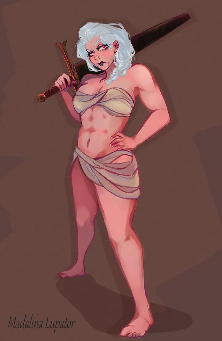 Madalina Lupator, once a hackneyed mercenary from a once great house of demons who had long lost all of their wealth. Now with her heirloom blade, Moroi, she is now personal guard and lover to Venser Karkaldwin and his family who faithful serves by their side through thick and thin. This piece depicts her in simple training gear commonly worn by athletes in the Grand Games, wielding the ancient sword Moroi.