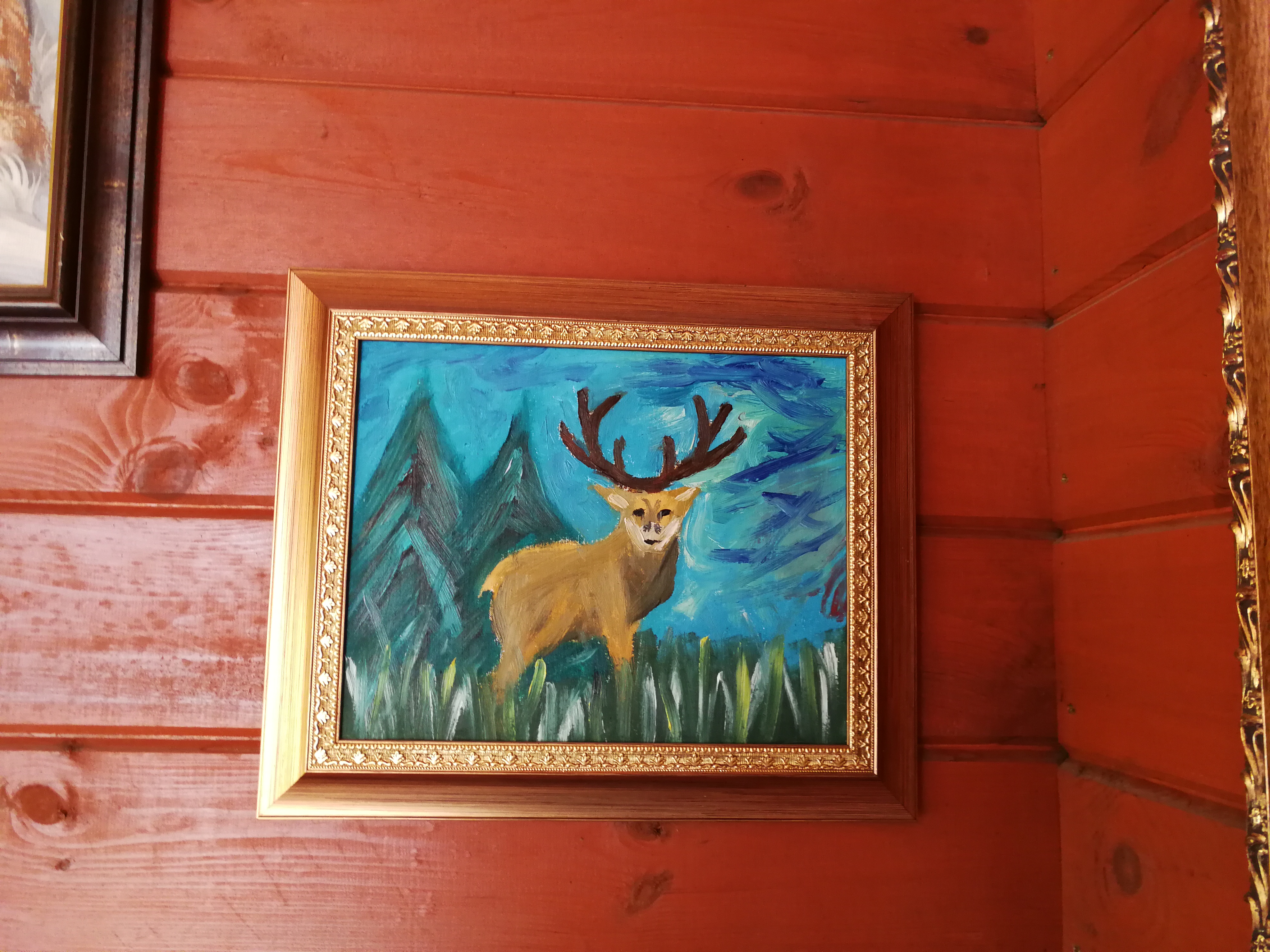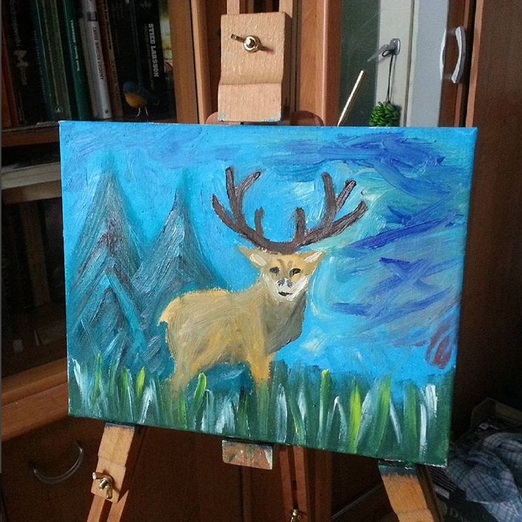 When my uncle bought a forest house after some hunter, I decided to paint a picture in a forest-hunting atmosphere. Once in the chain store I bought acrylic, watercolor and oil paints. I've already painted all of them except oil paints, so I decided it’s a good moment to try them out. However, it turned out that it is not so easy because they behaved differently than those. My total lack of understanding of oil paints meant that I did not feel well because there was still something on the canvas that I did not want or did not expect, but the final effect was so funy, so I decided to give what came out. The worst in oil paints was the drying time, the canvas was only a day and a half to dry. I spent a lot of time with the open windows with the dryer in my hand, then framed the picture in a frame and packed it nicely. Aunt and uncle liked my gift and it looks great on the wall in a forest cottage.
