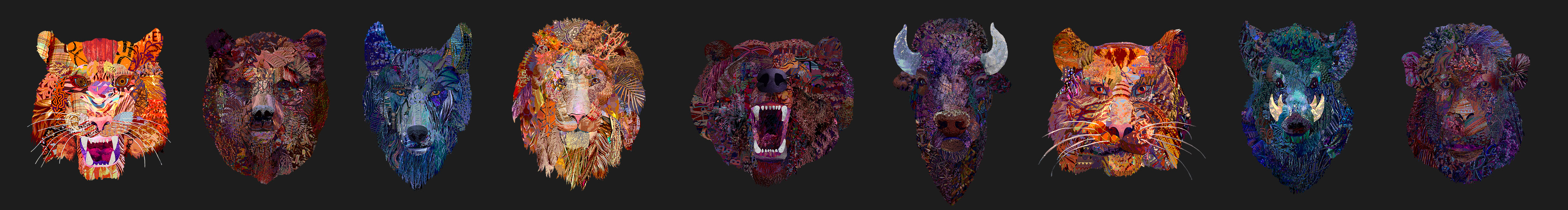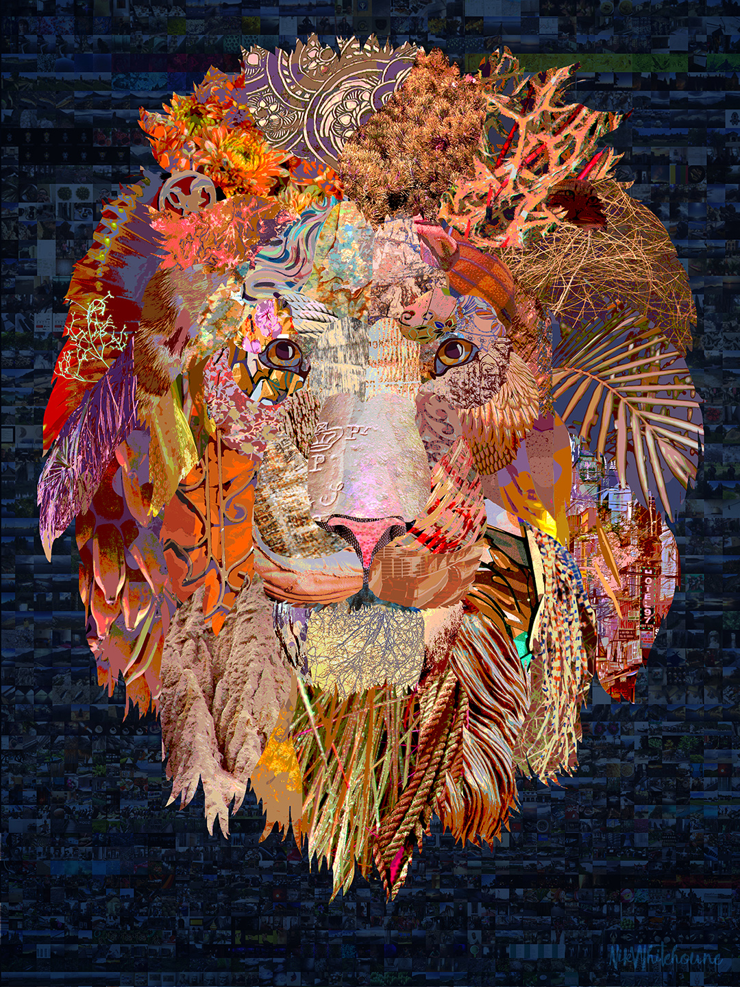 The technique is as follows. At first I drew a sketch on paper with a pencil. A fairly simple, linear pattern with the designation of the main forms, details and features of the animal. Then transferred it to a digital format and here it was already divided into fragments, “patches”, according to the form and volumes, as I imagined them. Each image was obtained from several dozen such patches. I came up with the idea that these works should have a resolution sufficient to print at least 600x900mm with high-quality printing. So the files were created large enough and fragments of photographs, which were then customized into patches, turned out to be detailed. This is the most interesting and fascinating stage of work - the search and selection of photos for the formed images. Of course, the work is not fast - many hours were spent only on finding the right shots in the archives, in which the correct content, suitable textures, color, details and tone ratios were present. For each patch, I looked at new pictures every time - I tried so that there were no repetitions. Here it would be possible to complicate the task even further and for each image to look for its own specific theme or link to a specific event or phenomenon, then it would turn out, for example, an “Avatar of Bangkok streets”, which would be collected only from street photo materials made in the capital of Thailand. But this is a really difficult, time-consuming task that would require even more time and attention, and here I could not afford to get toodeep in the process. Fragments of selected photographs were placed in patches taken from the sketch and then using manipulations in the graphics editor, stylized to bring them into line with the color-tonal component of the work being formed. Then they fit in place, weaving into a single "fabric" of the image. And so it was repeated until all the patches were filled with the correct fragments of the photo, combining well with each other inside the whole image. On the formation of one portrait of an animal, it took me an average of about 10 hours.