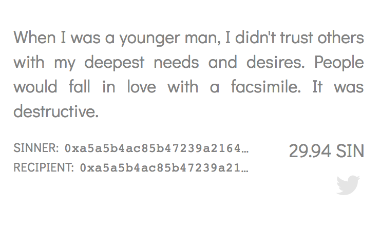 On a personal level, I’ve found the experience of using TetzelCoin to be cathartic in a way I didn’t anticipate. I’ve confessed many times over the last month while building TetzelCoin and I still find release from doing it. Owing to its lack of judgment, TetzelCoin gives me an unexpected space to reflect and be honest with myself. Enshrining my sin in the permanent ledger of the blockchain allows me to express vulnerability and be free of the guilt I feel, which really stems from shame. The value of the “sin” is not as important as the fact that I’ve admitted it to myself and let it go by committing it to the blockchain. In truth, I am the holder of my own spiritual liabilities. To let them go all I have to do is forgive myself.