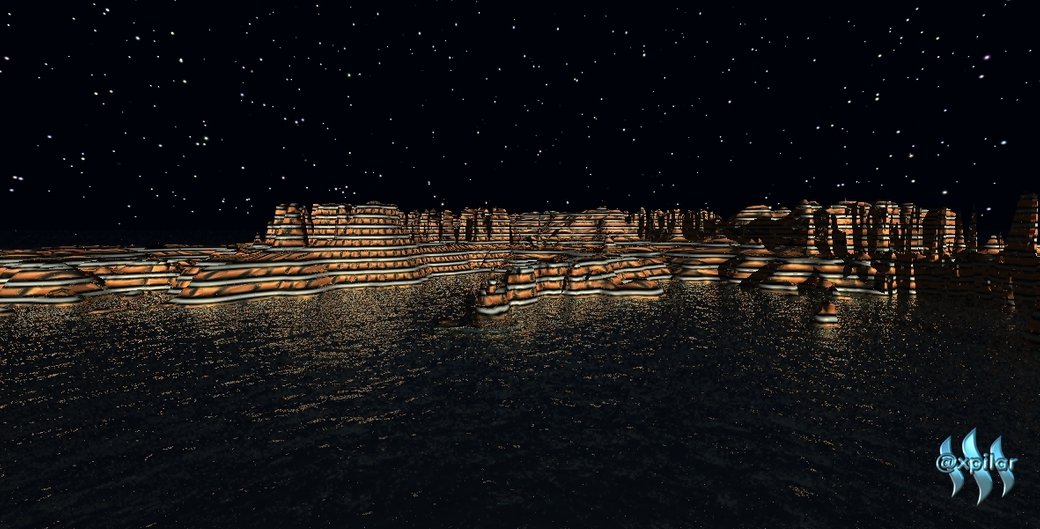 it looks like we are sitting in Amusement park some water show is going on. It looks like beautiful lighting with the stage. and sky with full of stares make this art more beautiful. we can see the reflection of starts and lighting in the water. beautiful digital art my friend..