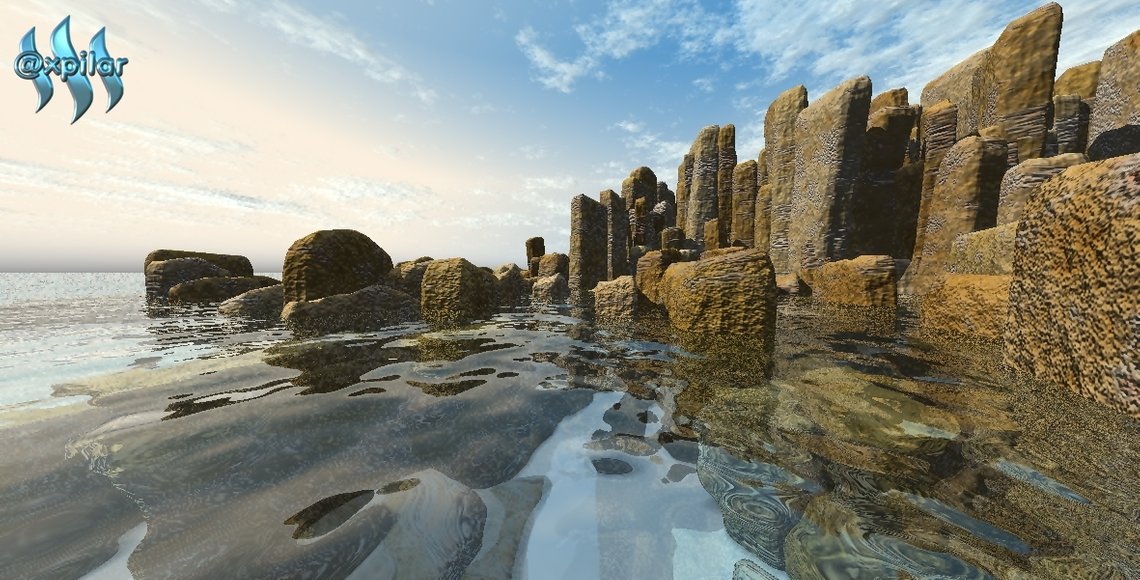 Combining elements of water, stone and sky. the soothing beauty of the eyes. The calm color makes us feel calm seeing it. I just make a comment with this word. I hope you accept itThe blue glow of the sky looms on the sea water