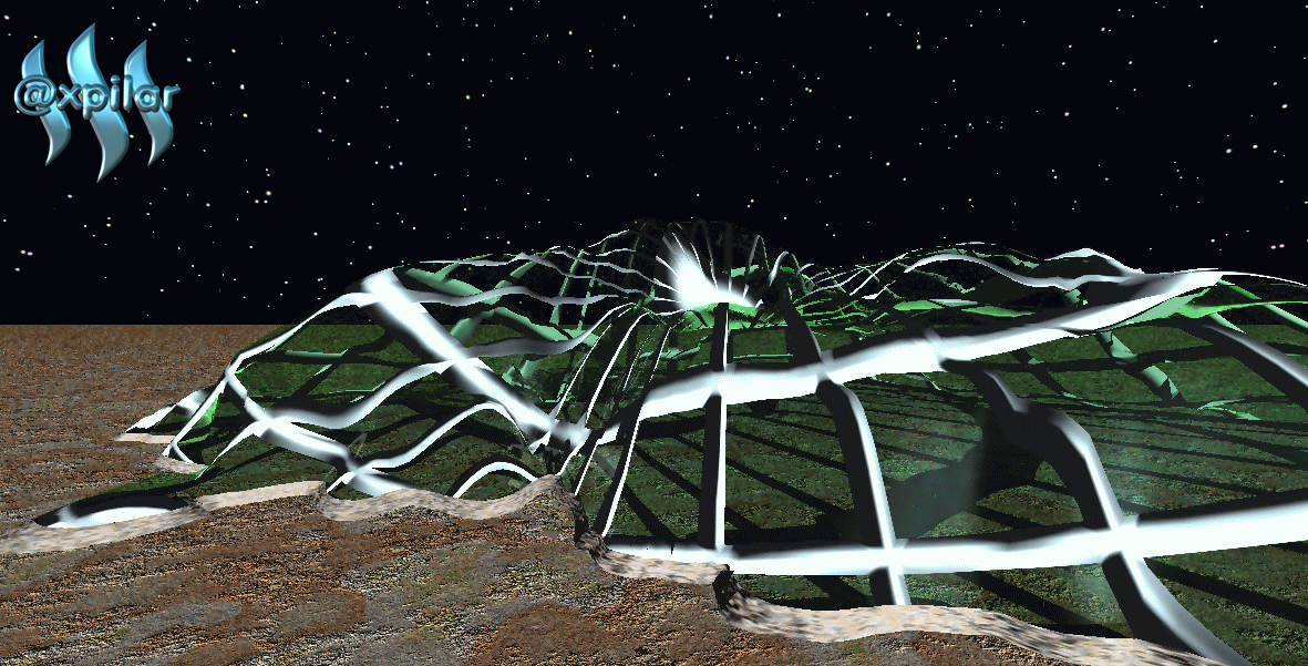 it looks like planet mars. and big spider make his net on the surface of planet mars. in the center of his net it puts white light so it attracts to hunting. and the sky is looks like space. Amazing digital art my friend..