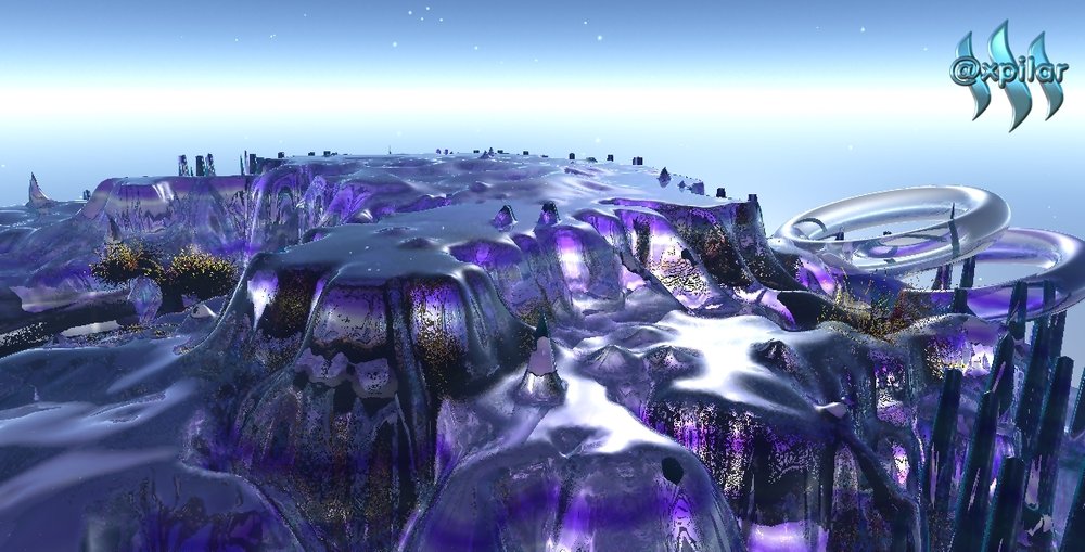 my imagination says that it is a mountain made of jelly "purple" you see that has several shrubs, the horizon is a blue sky with a white line full of stars, what my imagination is not clear are those rings on the right side, can be lookouts where people enter them and can better appreciate the landscape or can be those hooks used by climbers to secure their rope to climb mountains.