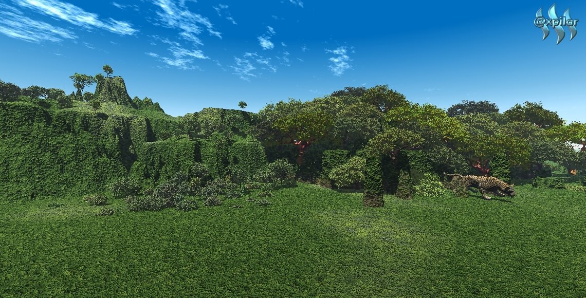 The sky is blue and the weather is clear above the forest, and I think this is a protected forest that is always manicured, because it looks neat even to the regular grass, I also feel that the animals on the edge of the forest are protected species, but I do not know the name of the animal