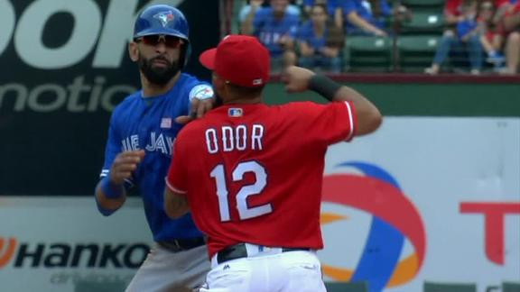 El momento fue este, un lance en segunda base por parte de José Bautista, el cual llego a la primera base golpeado por un picheo, cabe destacar que fue golpeado con toda la intención debido a lo mencionado antes, su manera de celebrar sus Hr.