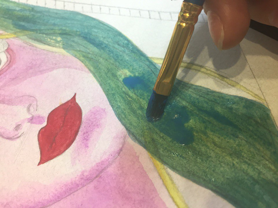 At this stage, I'm almost at the end, I dyed skin, hair, make-up: shadows, arrows on eyes, lipstick on lips. I love painting, and I love doing makeup for my watercolor heroes.